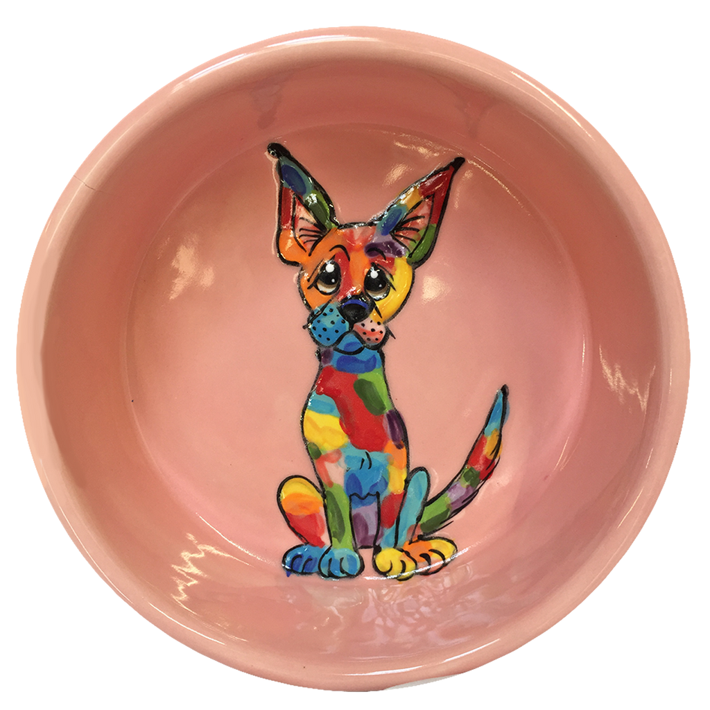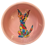Adorable Rainbow Palz™ Boston Terrier doggie shown on this ceramic food/water bowl with complimenting hand-mixed background color.