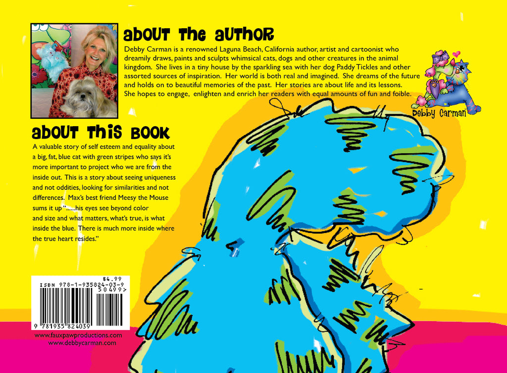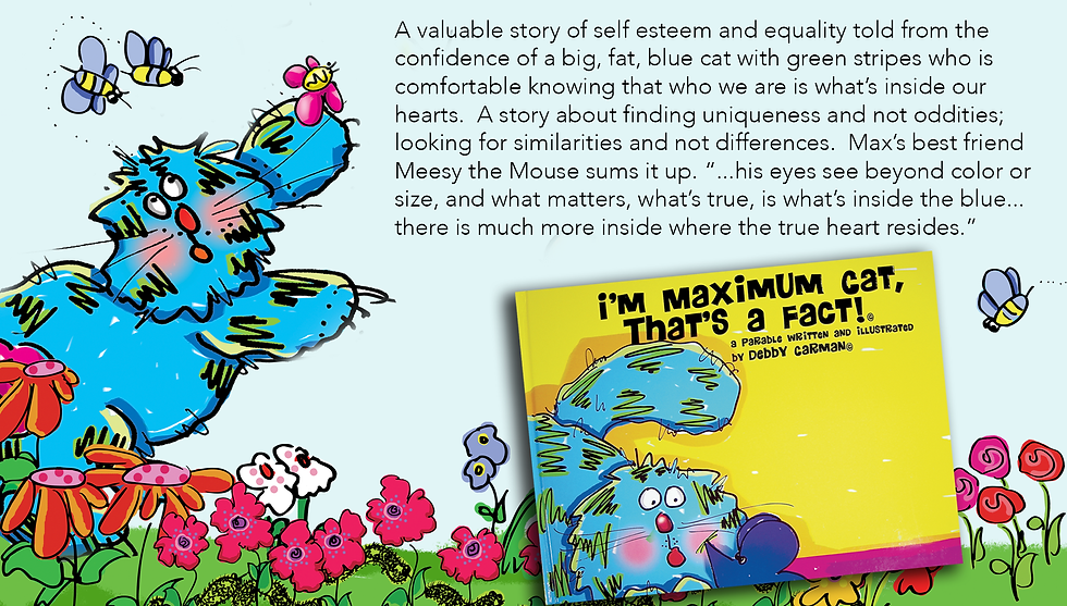 A valuable story of self esteem and equality about a big, fat, blue cat with green stripes who says it’s more important to project who we are from the inside out. This is a story about seeing uniqueness and not oddities, looking for similarities and not differences. Max’s best friend Meesy the Mouse sums it up “......his eyes see beyond color and size and what matters, what’s true, is what inside the blue. There is much more inside where the true heart resides.”