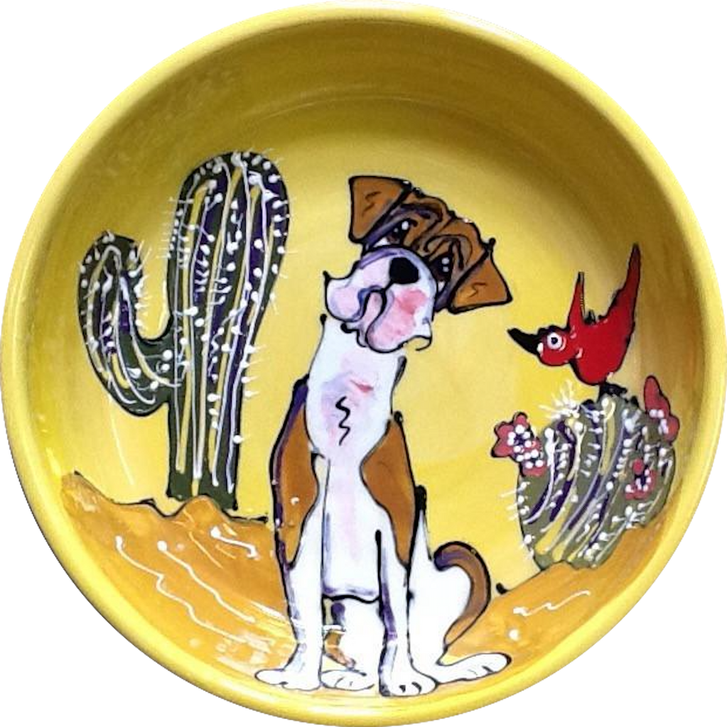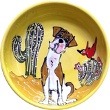Adorable doggie shown on this ceramic food/water bowl with complimenting hand-mixed background color.