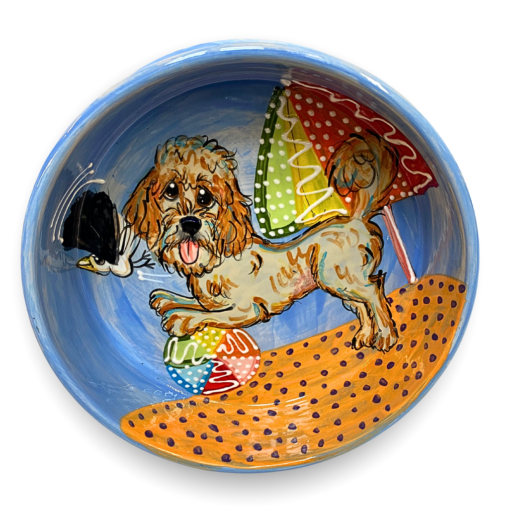 Brighten up your pup's mealtimes with the Golden Doodle Bowl! Hand-painted with an adorable beach ball playing golden doodle, this ceramic food and water bowl will have your pup galloping around with glee! Keep your pup happy and hydrated - life's a beach with the Golden Doodle Bowl!