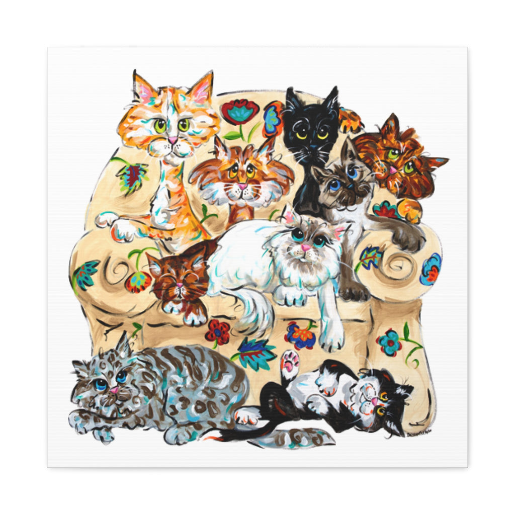 With sizes ranging from the cozy 18”x 18” to the grand 36x36 inches, there's a purr-fect fit for every room. Immerse yourself in a whimsical scene that's alive with colorful blooms and the most charismatic clowder of cats you've ever laid eyes on. Each canvas is expertly stretched and ready to grace your home with its presence, turning any wall into a showcase of feline splendor.