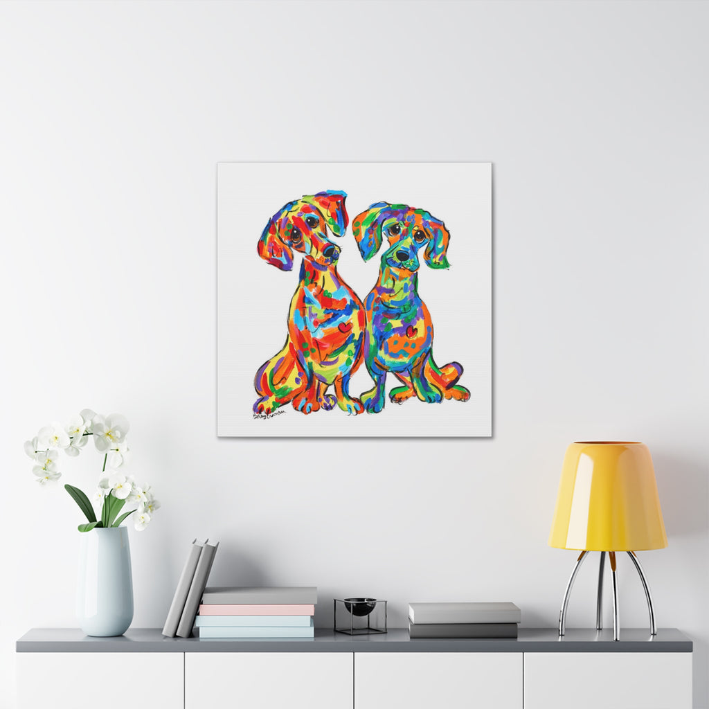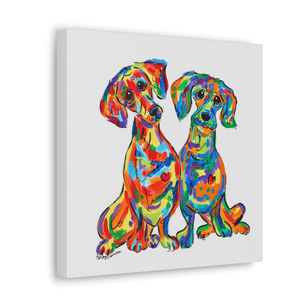 Immerse yourself in the world of "Double Doxie Love", a giclée print derived from the original acrylic Dachshund dog painting by renowned Laguna Beach artist Debby Carman.