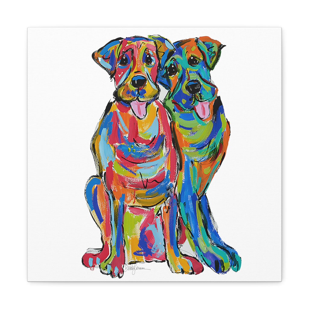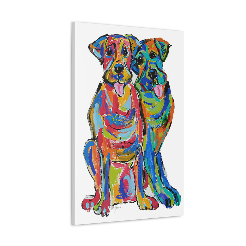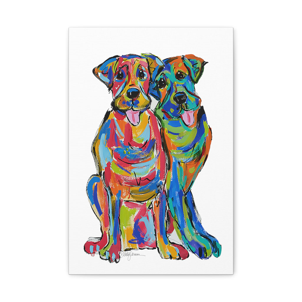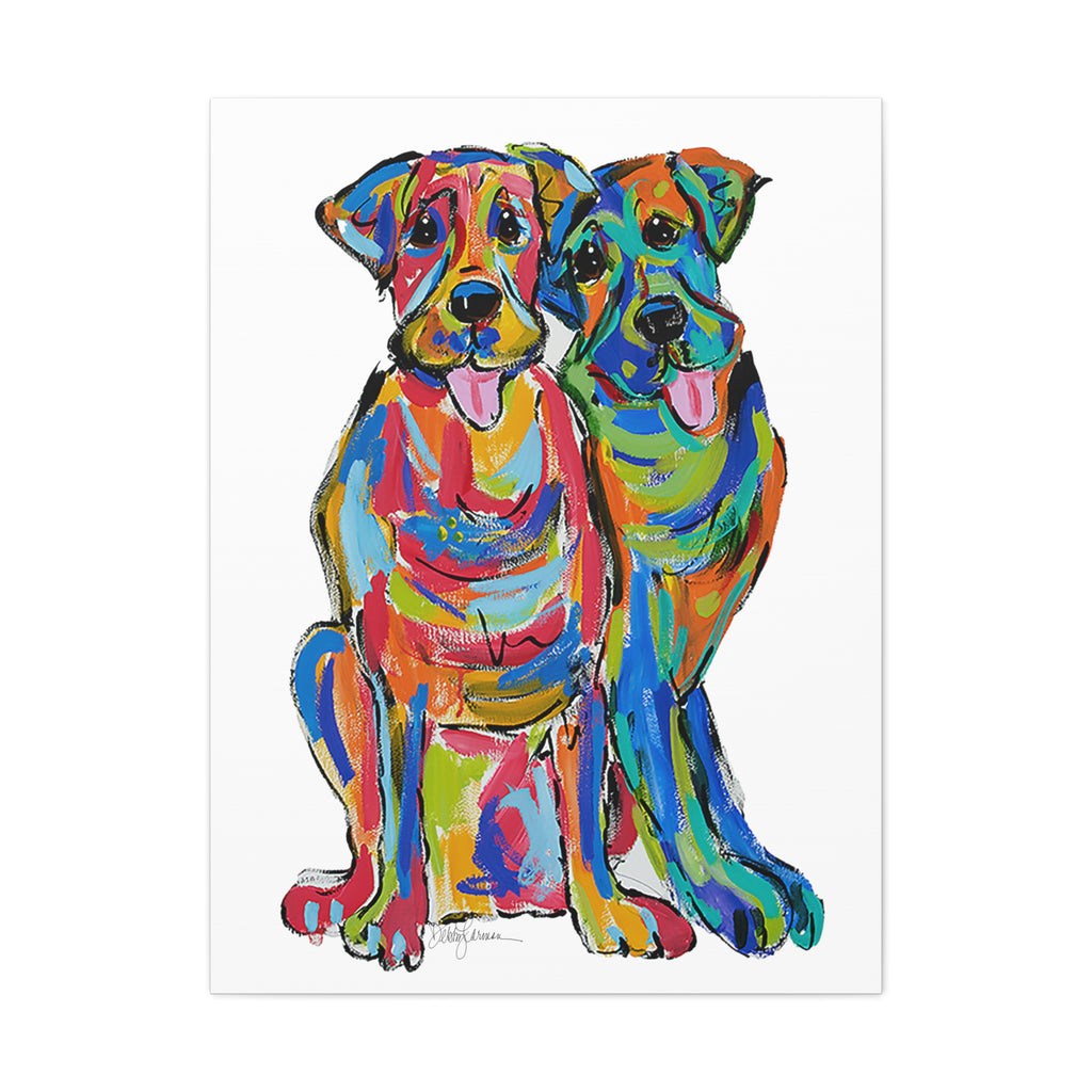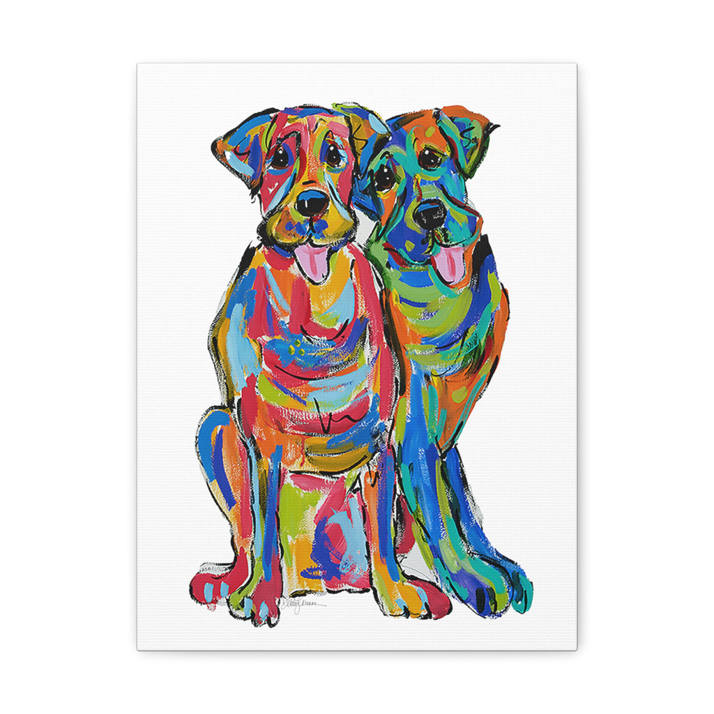 This artwork is offered in an array of sizes to beautifully complement any space in need of a burst of color and canine friendship. Whether for a dedicated dog lover or as a vibrant addition to your own decor, "Double Lab Love" brings a touch of heartwarming vibrancy to your surroundings. Every canvas is meticulously stretched, ensuring a gallery-quality display upon arrival.