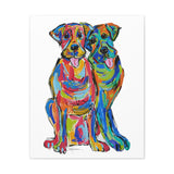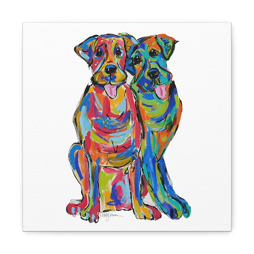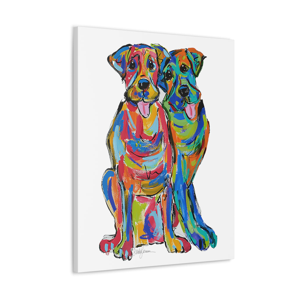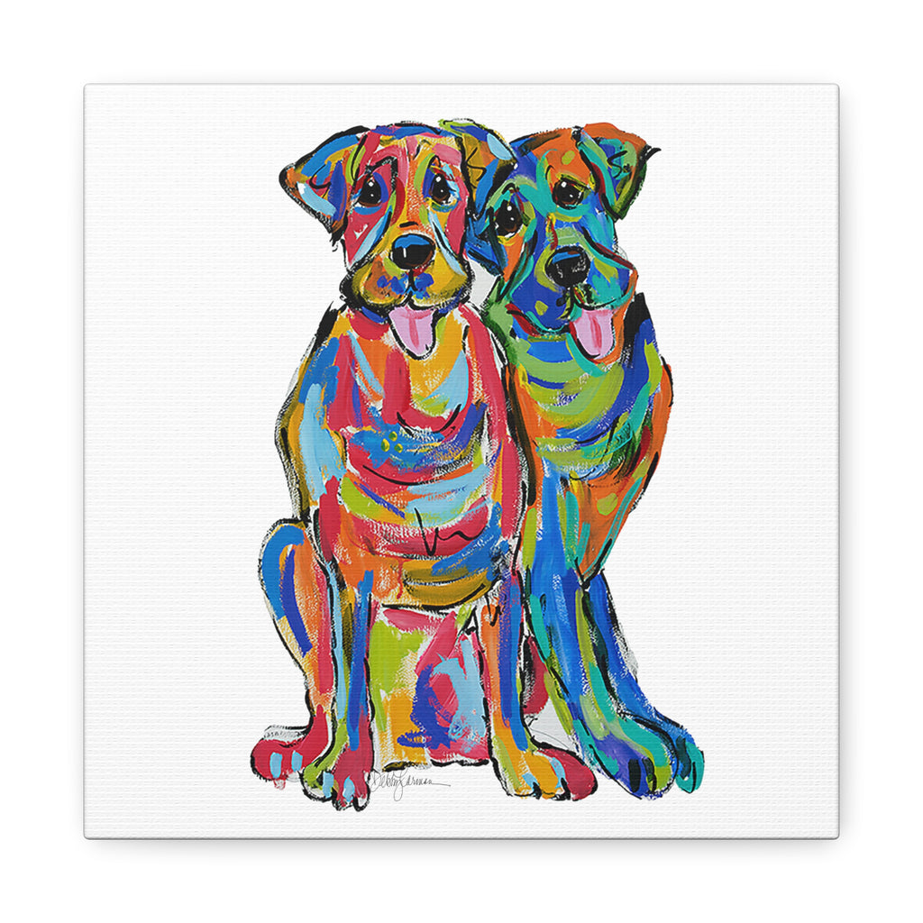 "Double Lab Love" by Debby Carman is a canvas reproduction that perfectly embodies the joyful essence and unbreakable bond of two Labrador companions. Awash in a rainbow of brilliant hues, this piece captures the playful nature and loving spirit that Labradors are celebrated for. Each dog's individuality and affection for its partner shines through in this vivid portrayal.