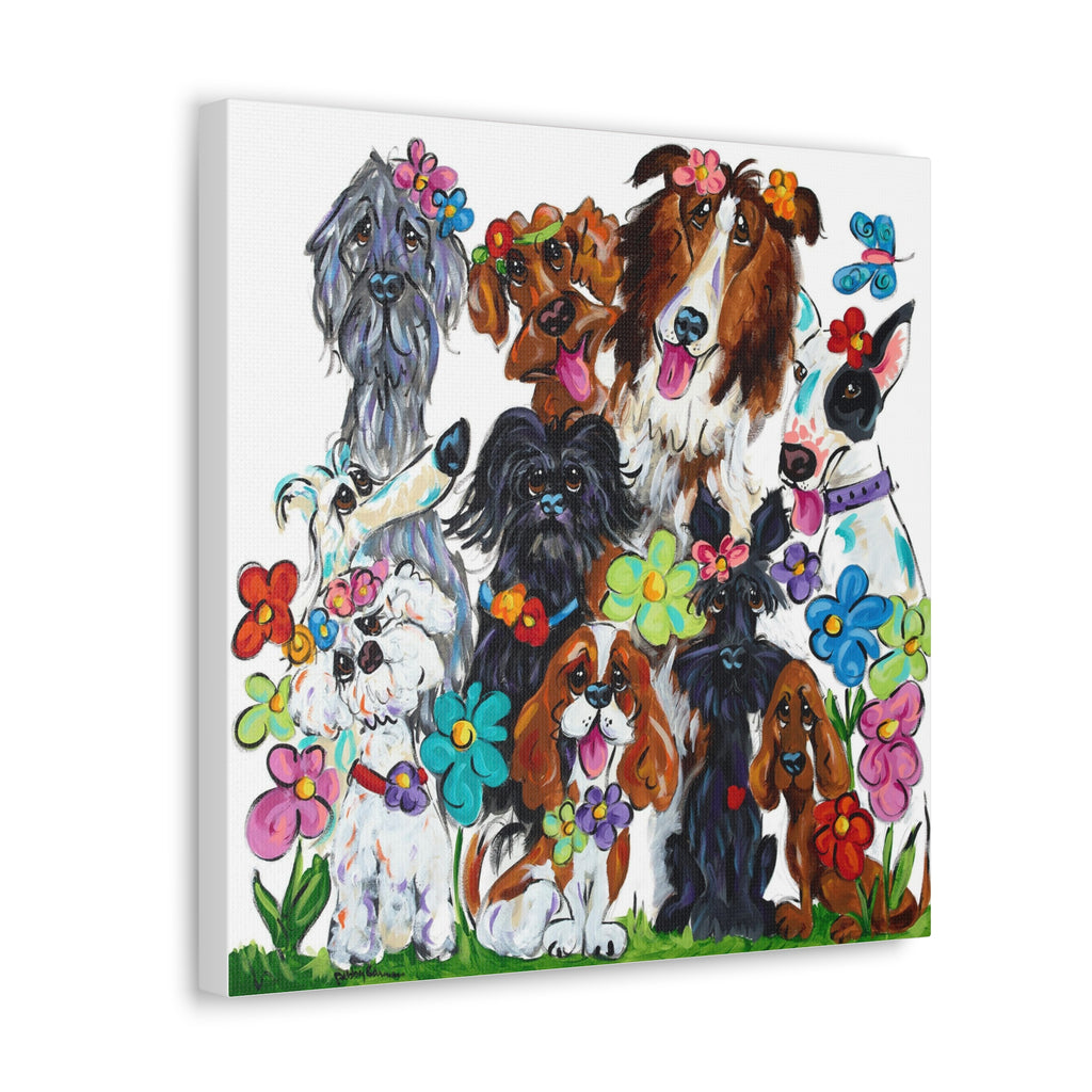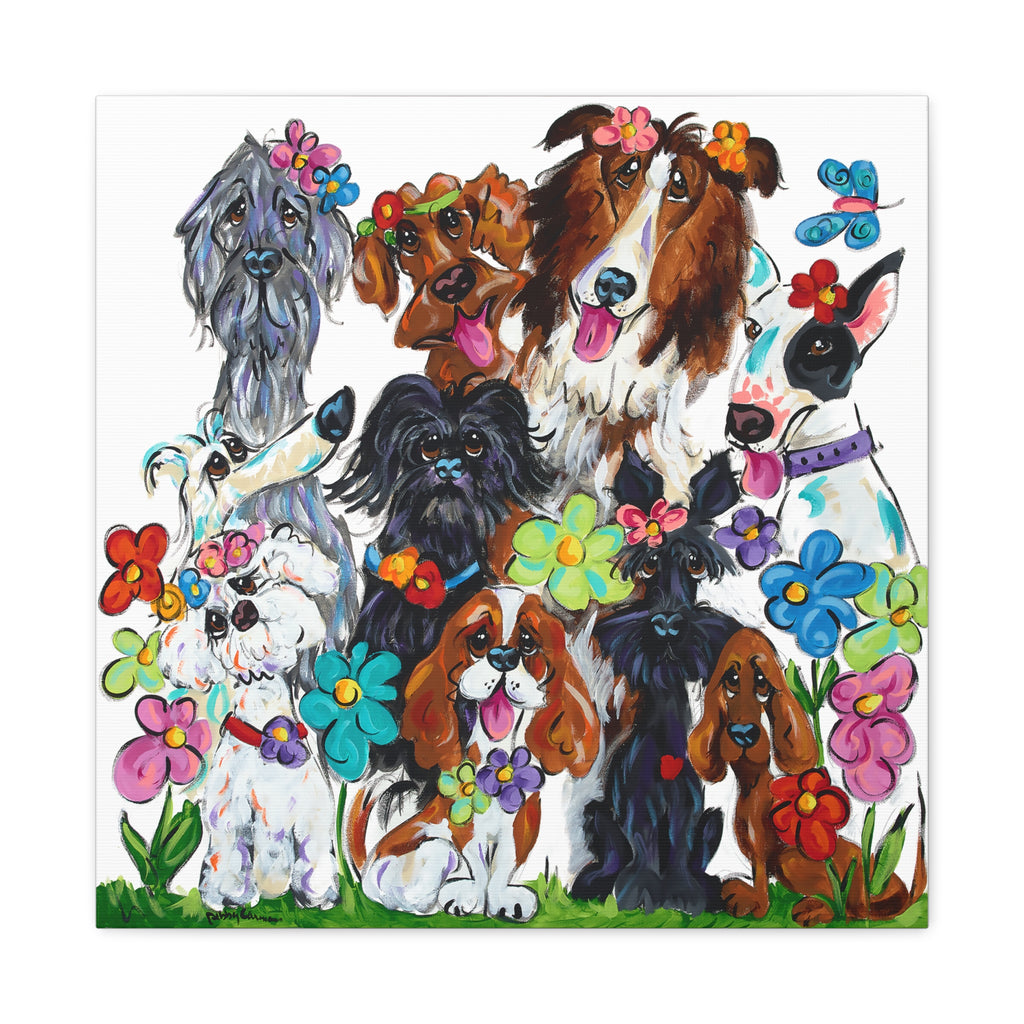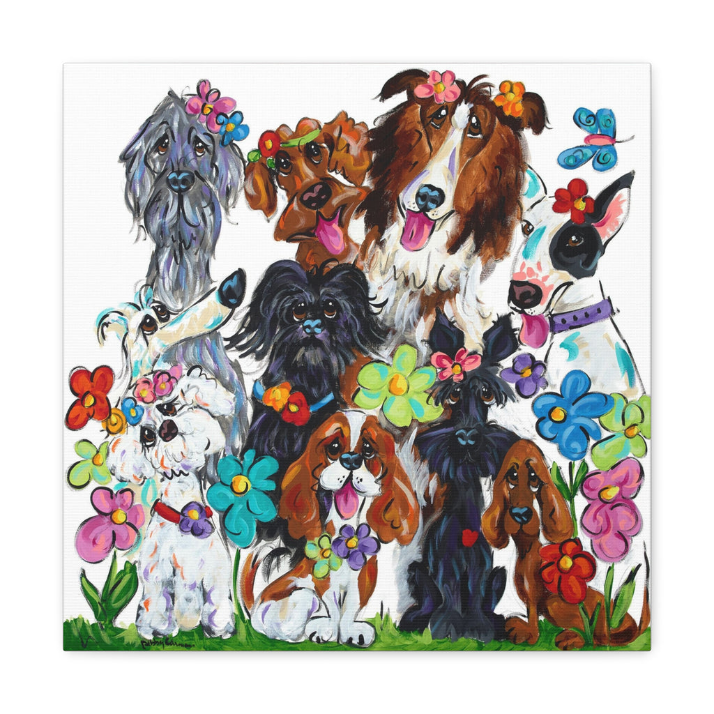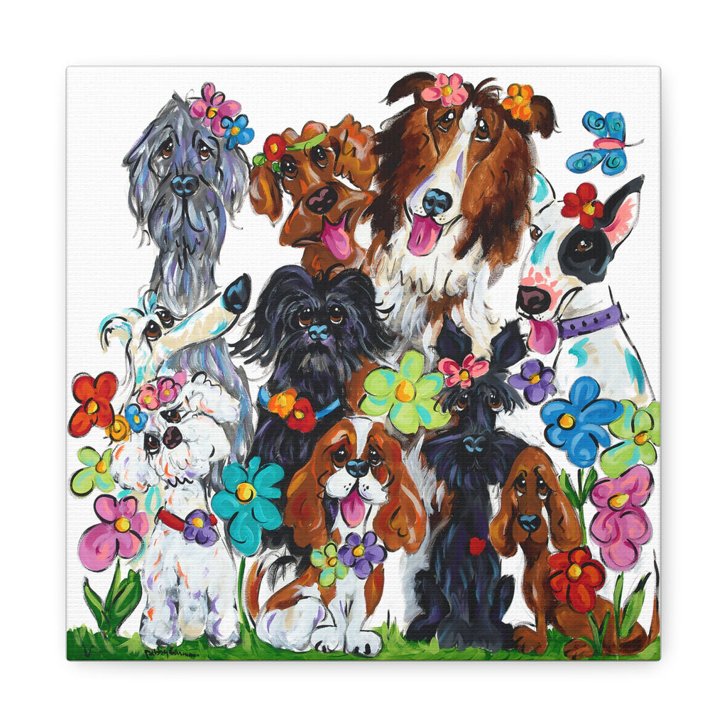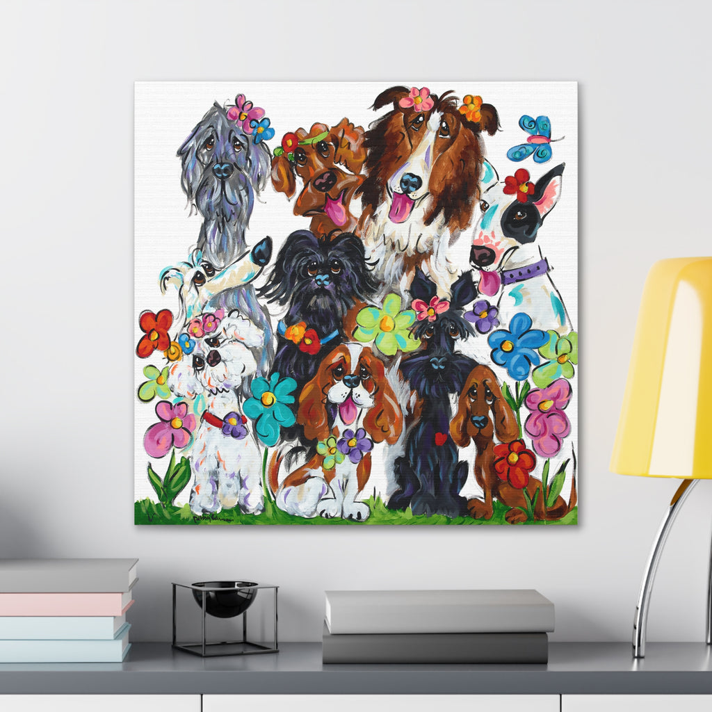 Available in a variety of sizes to fit your space perfectly: 10x10, 12x12, 16x16, 20x20, 24x24, 30x30, and 36x36 inches. Each canvas is meticulously stretched and ready to hang, ensuring a flawless display. Embrace the playful spirit of this delightful garden, where every petal and puppy smile brightens your day.