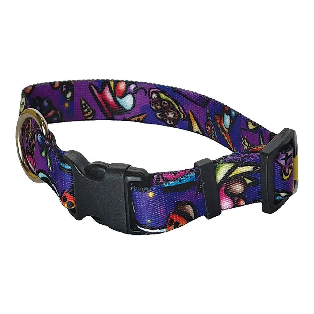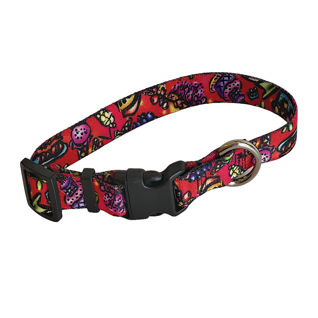 This dog collar utilizes a quick clasp closure, also called a side release clasp. Sizing is given as a range of neck lengths. Measure your dog’s neck size or its current collar length (not including buckles) to obtain correct sizing.