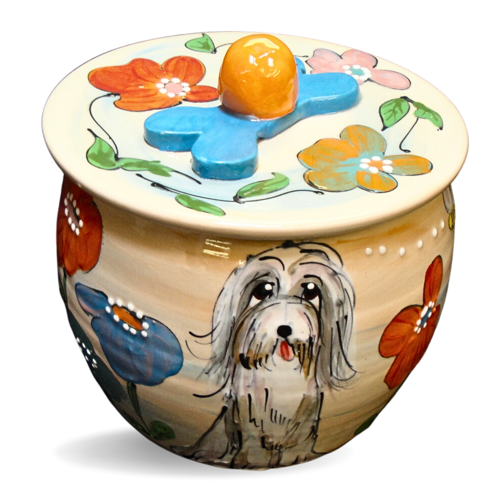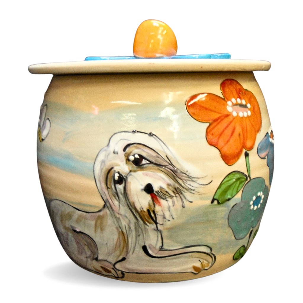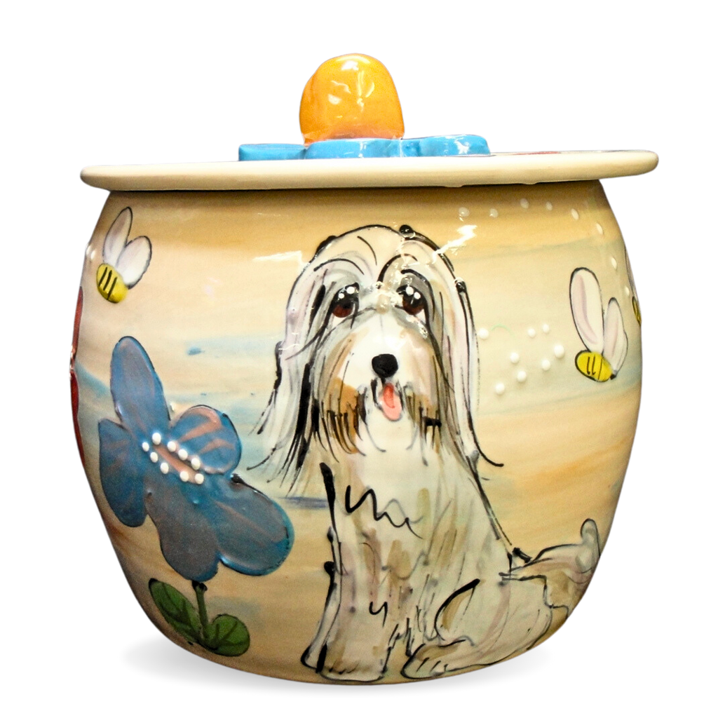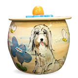 Keep your home looking as furry-nished as ever with this Bearded Collie Treat Jar. The detailed hand-painted flowers and Bearded Collie design make it a paw-fect addition to any pup-lovin' home! The round cookie jar is perfect for stashing your pet's treats or making a tail-waggin' trophy presentation.
