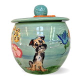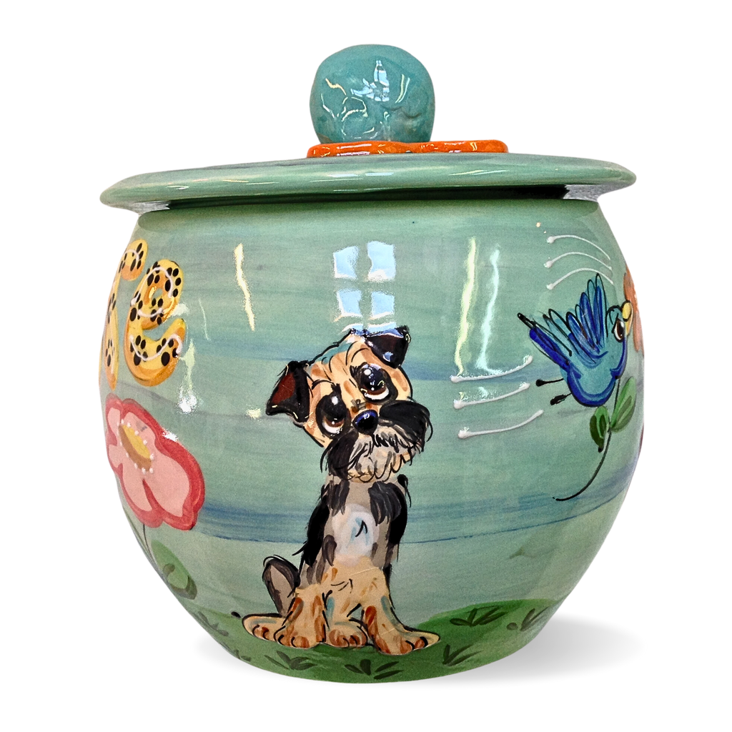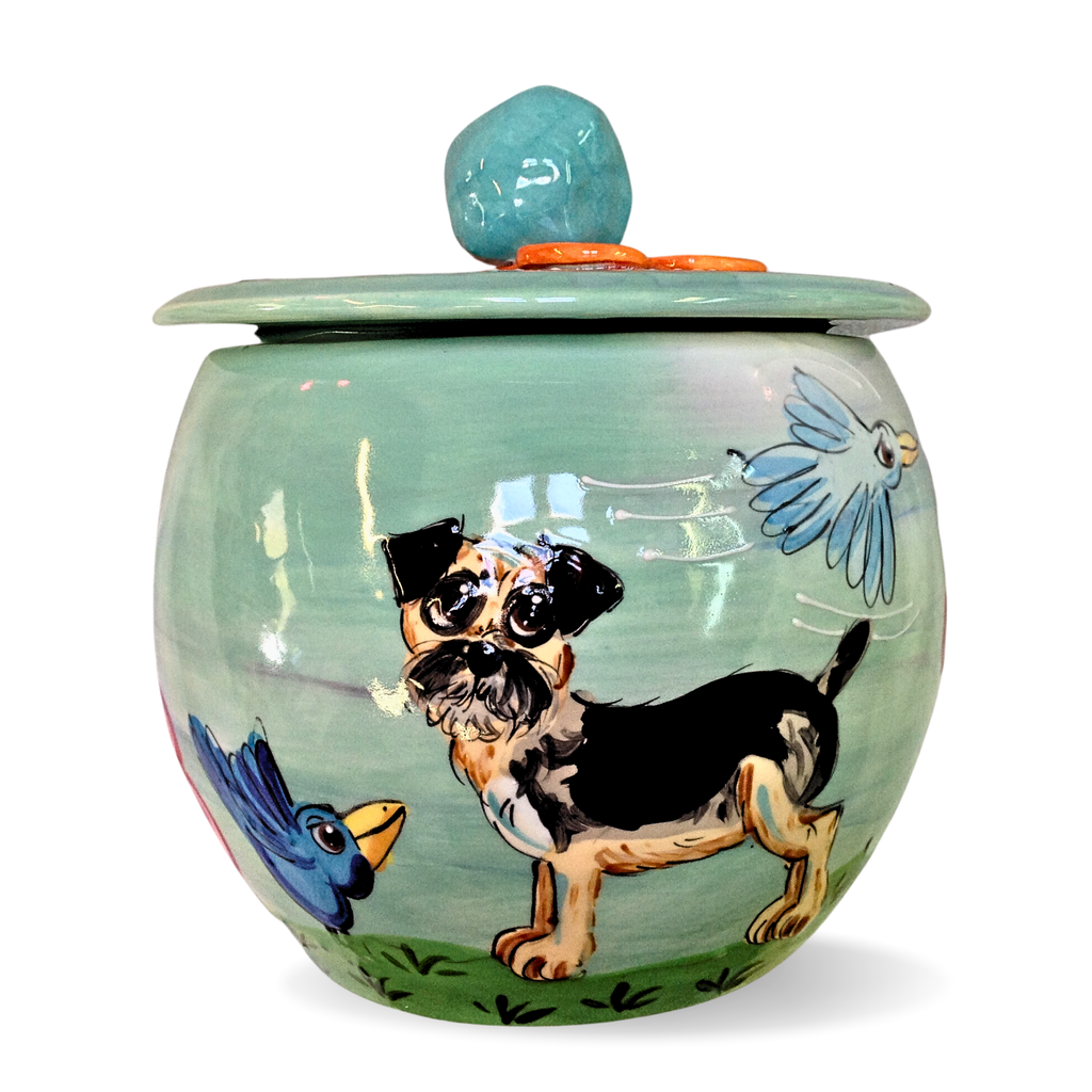 This personalized Border Terrier Treat Jar is a unique way to show love for your favorite four-legged friend. Crafted from ceramic and hand-painted with a classic Border Terrier portrait, this cookie jar is sure to make any dog lover's heart leap with joy. Personalize with a garden-inspired design for an extra special touch.
