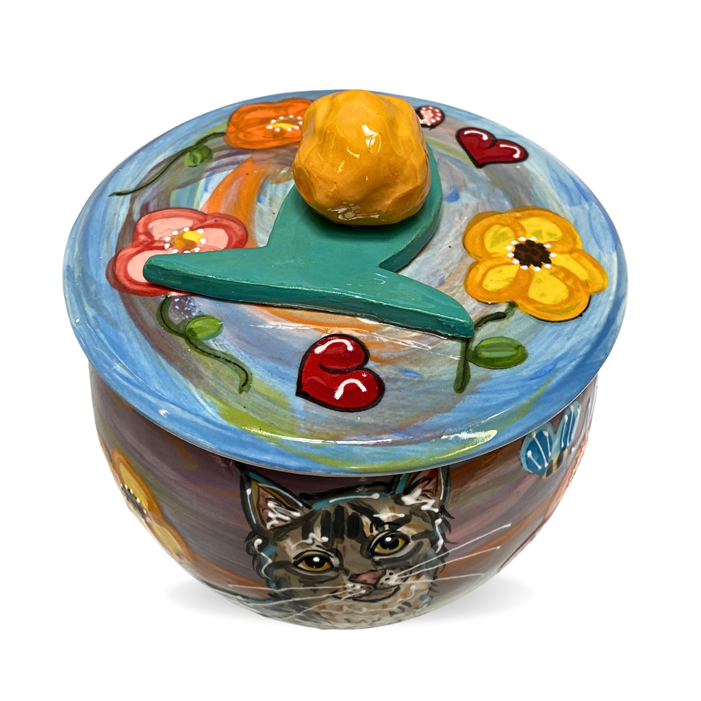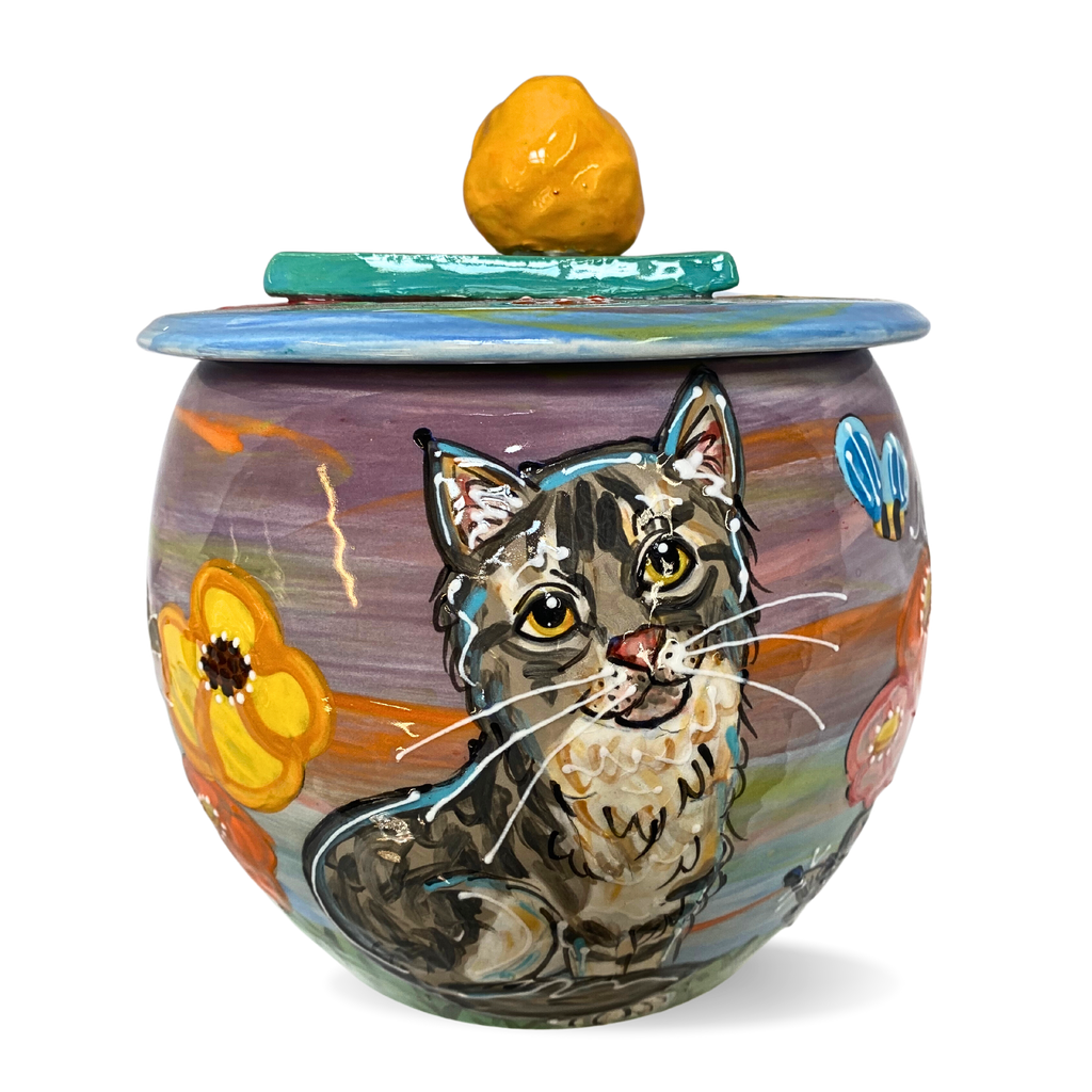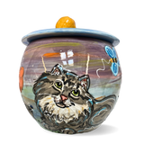 This hand-painted ceramic cat food jar is an ideal addition to your kitchen counter. Featuring a whimsical garden design and a portrait of your feline friend, this jar is designed to be both decorative and functional. Keep your pet's food fresh and accessible in this stylish and practical storage solution.