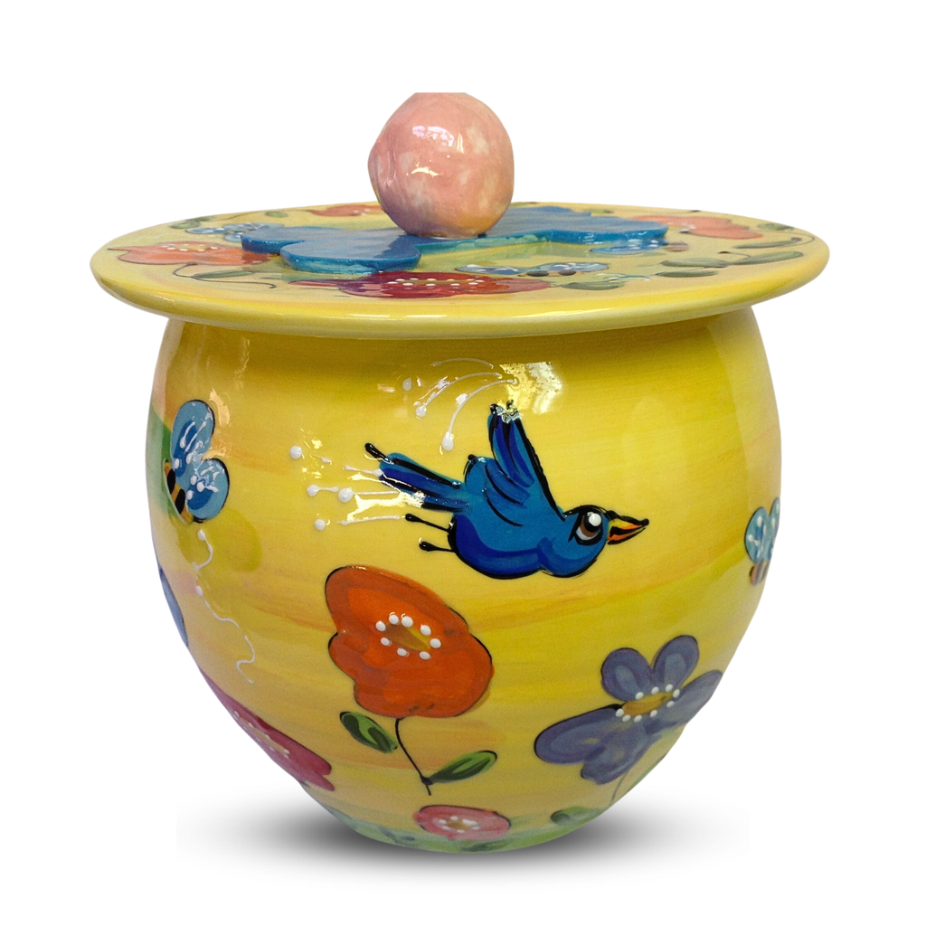 Each treat jar is hand thrown from the finest white porcelain china, hand-drawn, hand-painted, bisque fired for 16 hours, glazed with three hand-brushed applications, and finish fired for 8 more hours. Rubber gasket secure freshness seal. Food safe, dishwasher safe, non-toxic, and lead-free.