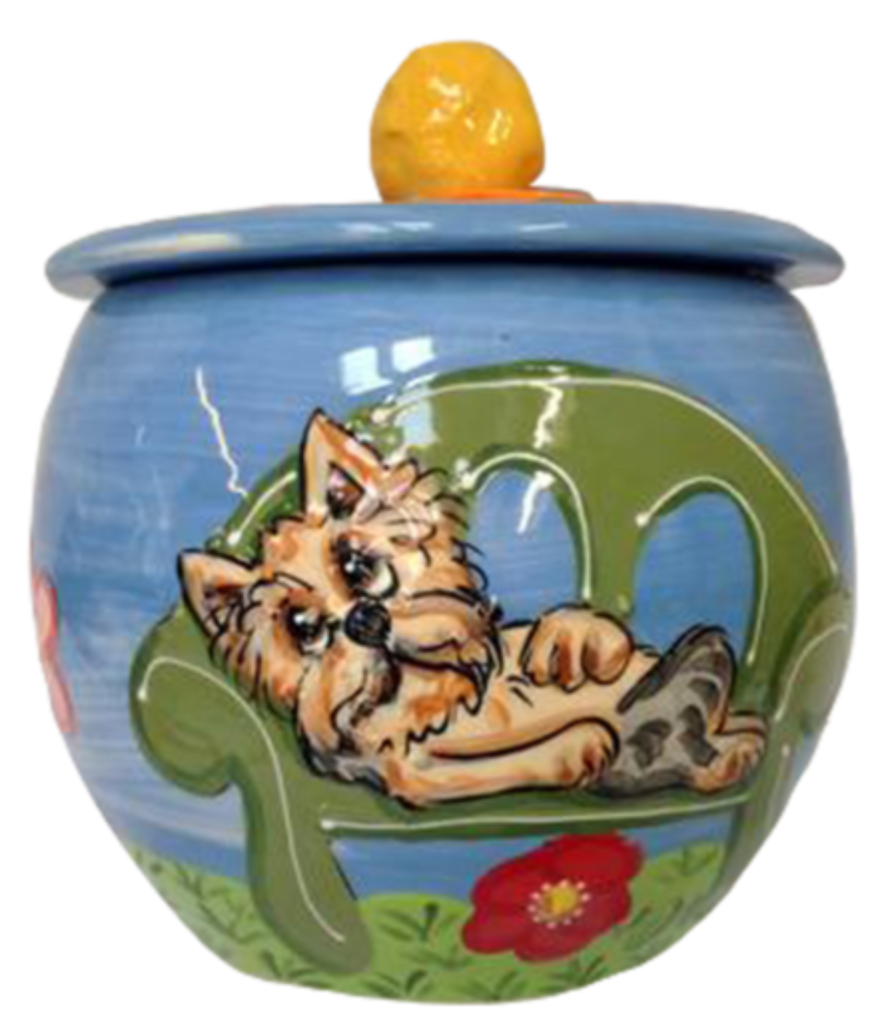 Custom Ceramic Pottery Dog Treat Jar featuring Yorkie Terrier. Unique and one of a kind, each piece is hand made in the USA.