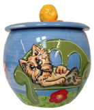 Each treat jar is hand thrown from the finest white porcelain china, hand-drawn, hand-painted, bisque fired for 16 hours, glazed with three hand-brushed applications, and finish fired for 8 more hours. Rubber gasket secure freshness seal. Food safe, dishwasher safe, non-toxic, and lead-free.
