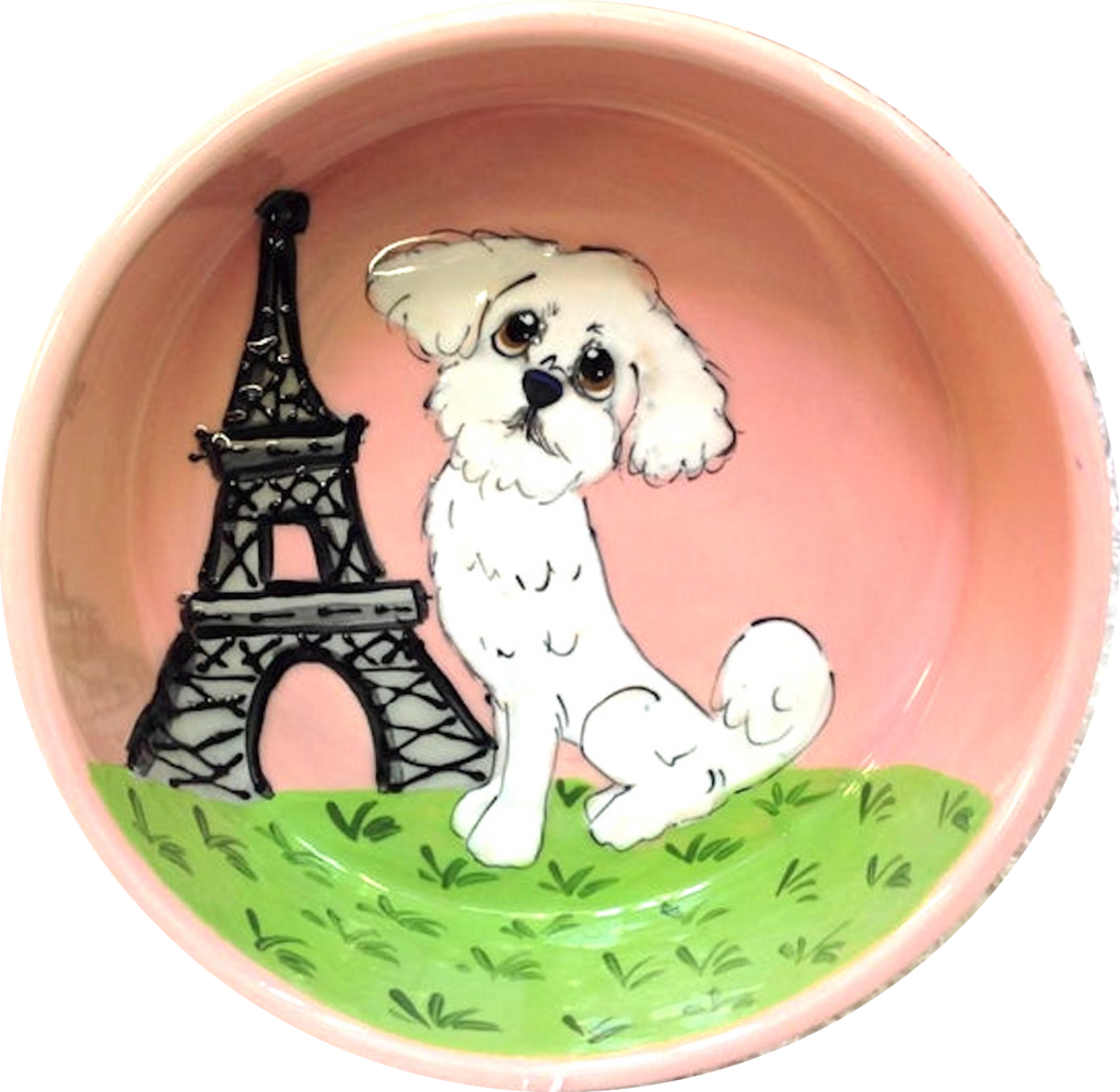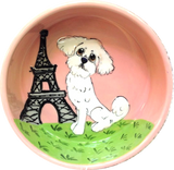 Adorable doggie shown on this ceramic food/water bowl with complimenting hand-mixed background color.