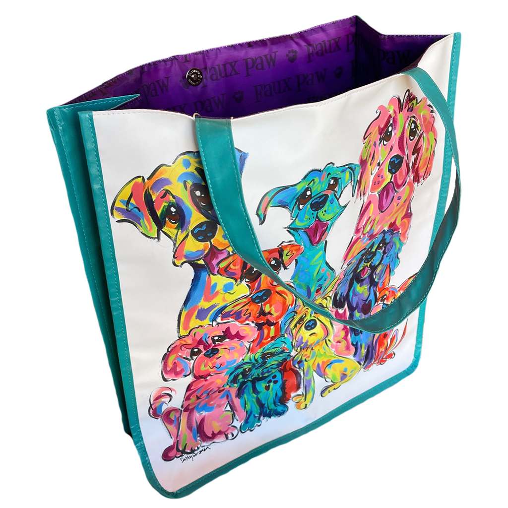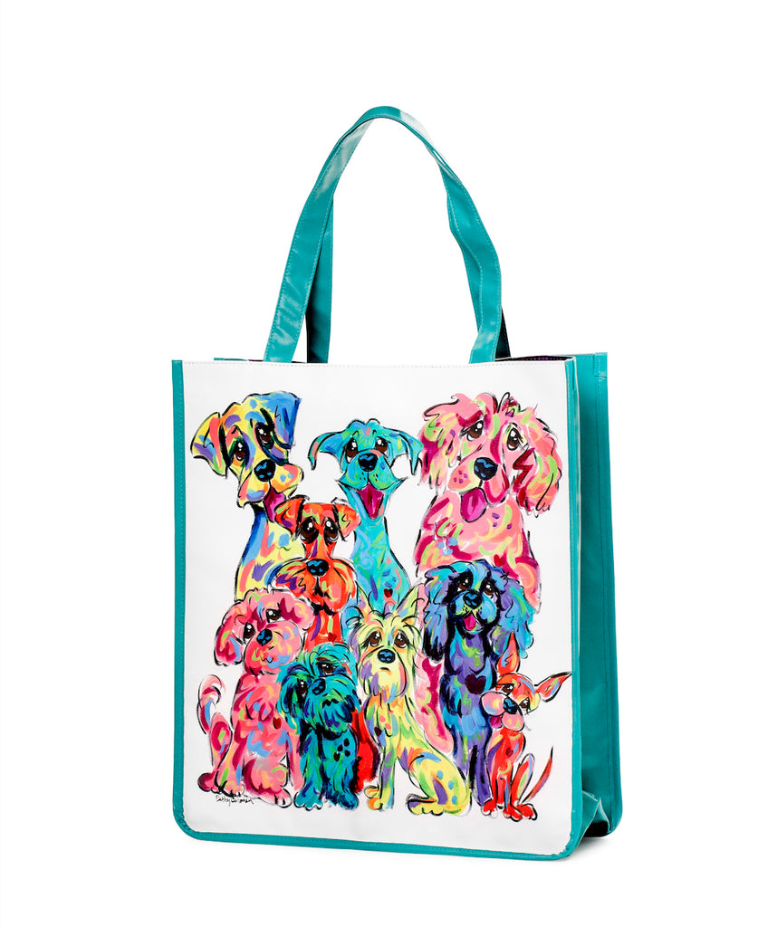 Introducing "Rainbow Palz," a stunning vinyl tote that seamlessly blends practicality with artistic flair. Designed by the renowned artist Debby Carman, this tote captures a lively ensemble of dogs, each rendered in vibrant hues that reflect their unique personalities.