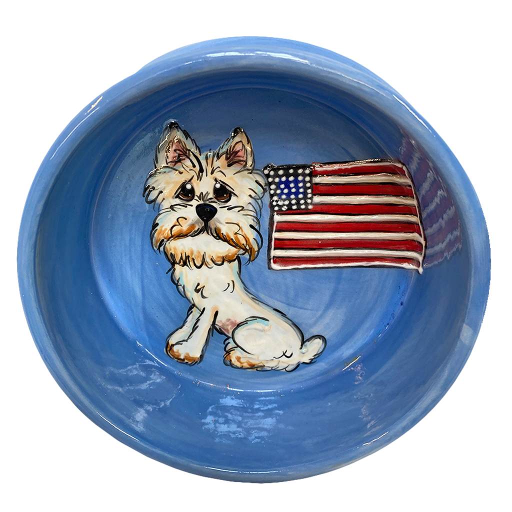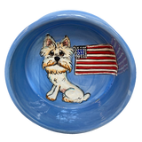 Adorable Westie dog shown on this ceramic food/water bowl with complimenting hand-mixed background color.