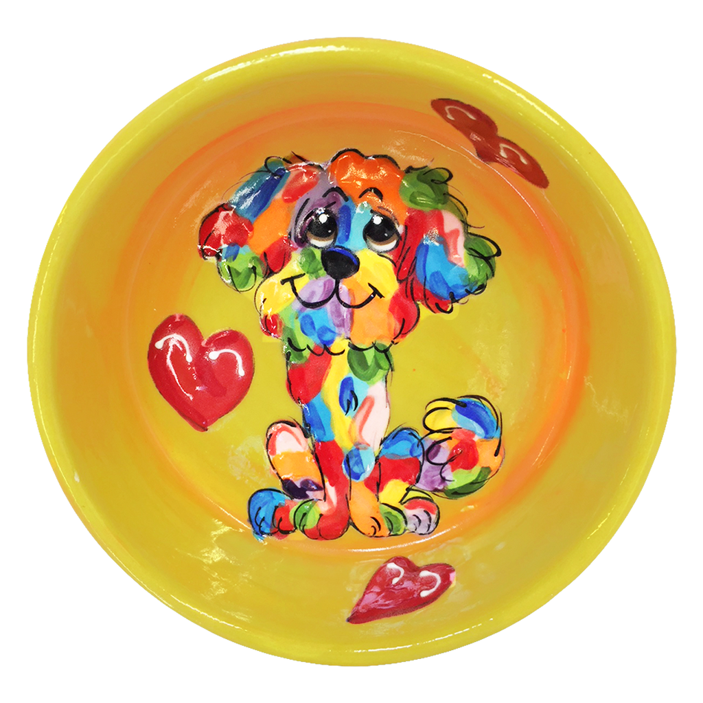 Adorable Rainbow Palz™ Bichon doggie shown on this ceramic food/water bowl with complimenting hand-mixed background color.