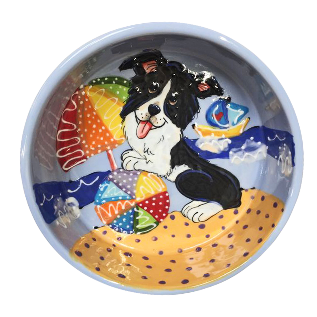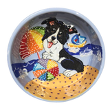 Adorable Border Collie doggie shown on this ceramic food/water bowl with complimenting hand-mixed background color.