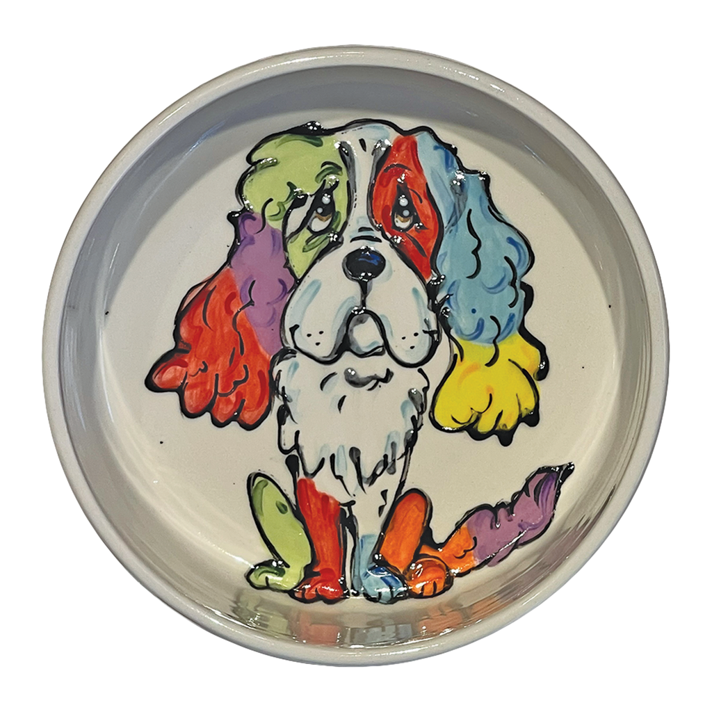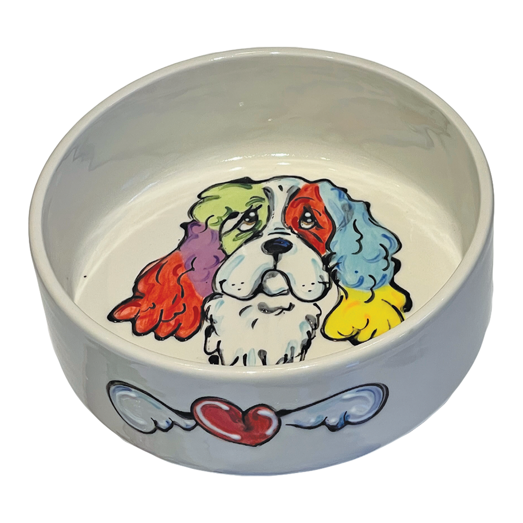 Adorable Rainbow Palz™ Cavalier doggie shown on this 6 inch ceramic food/water bowl.
