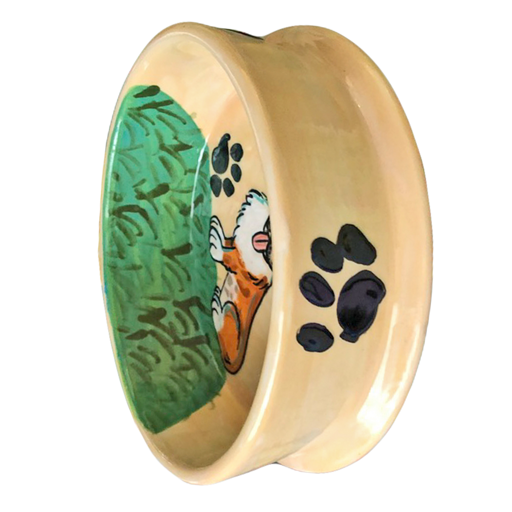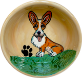 Adorable Corgi doggie shown on this ceramic food/water bowl with complimenting hand-mixed background color.