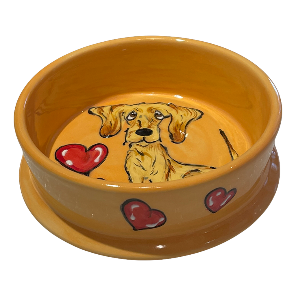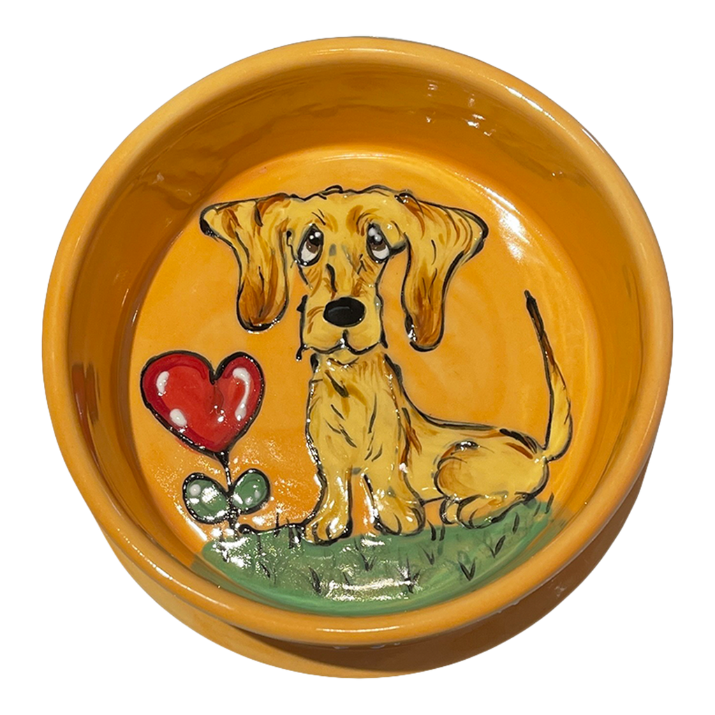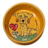 Dachshund doggie shown on ceramic food/water bowl with complimenting hand-mixed background color.