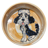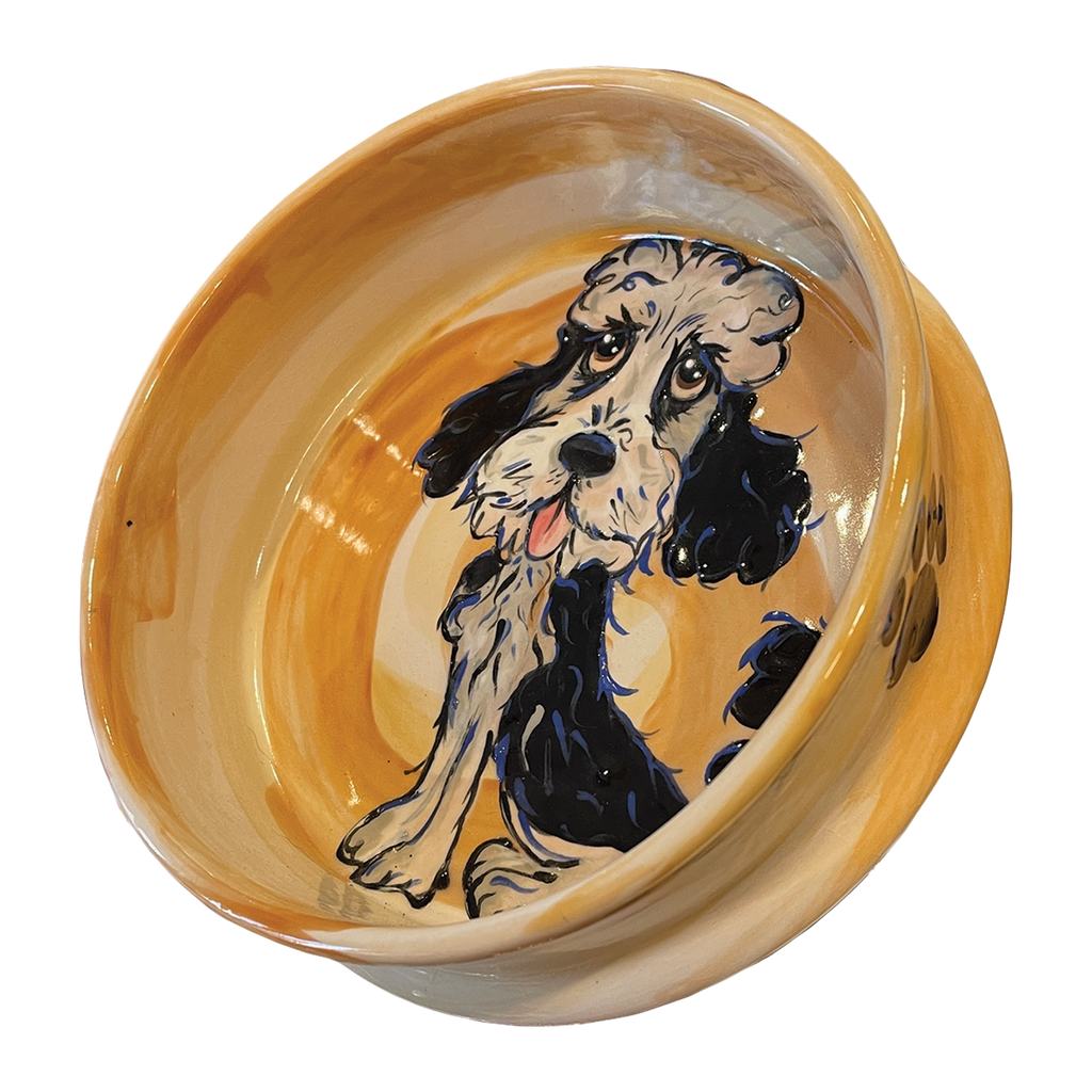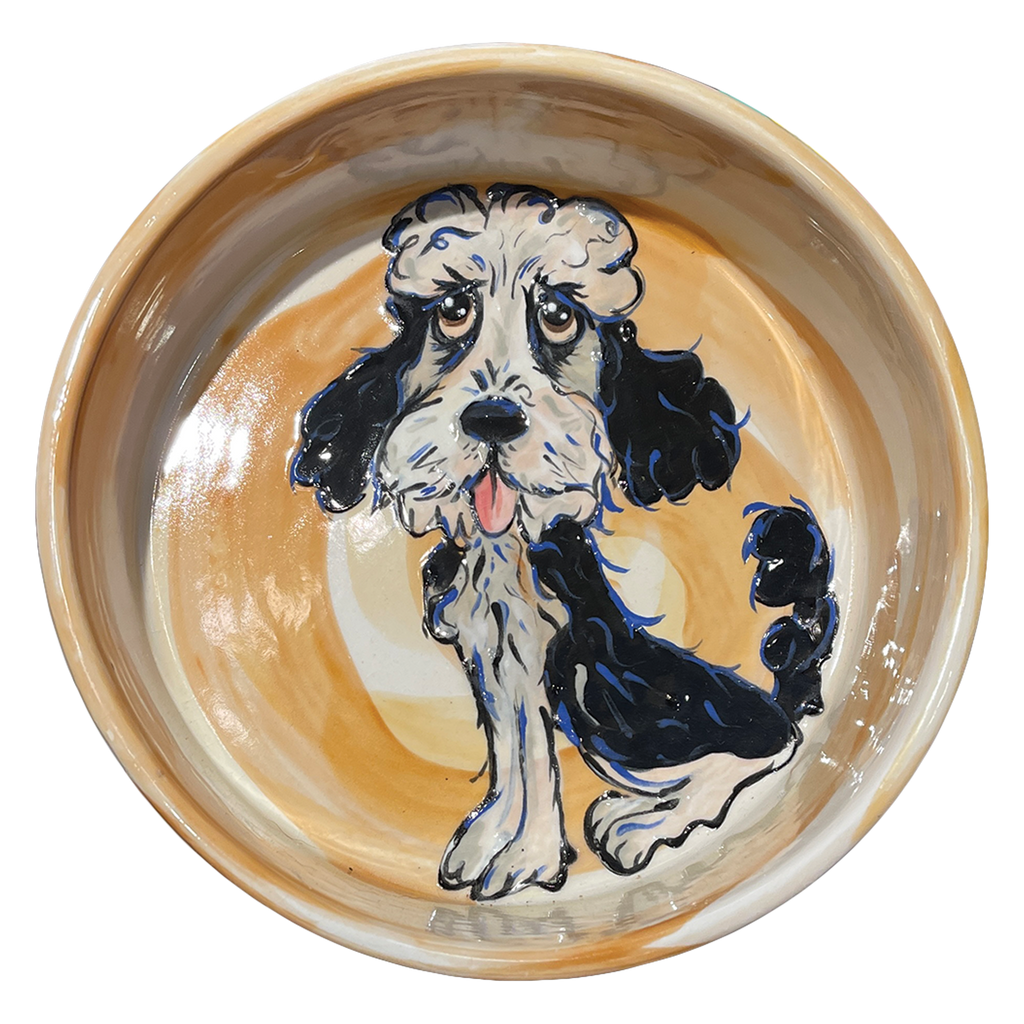 Doodle doggie shown on ceramic food/water bowl with complimenting hand-mixed background color.