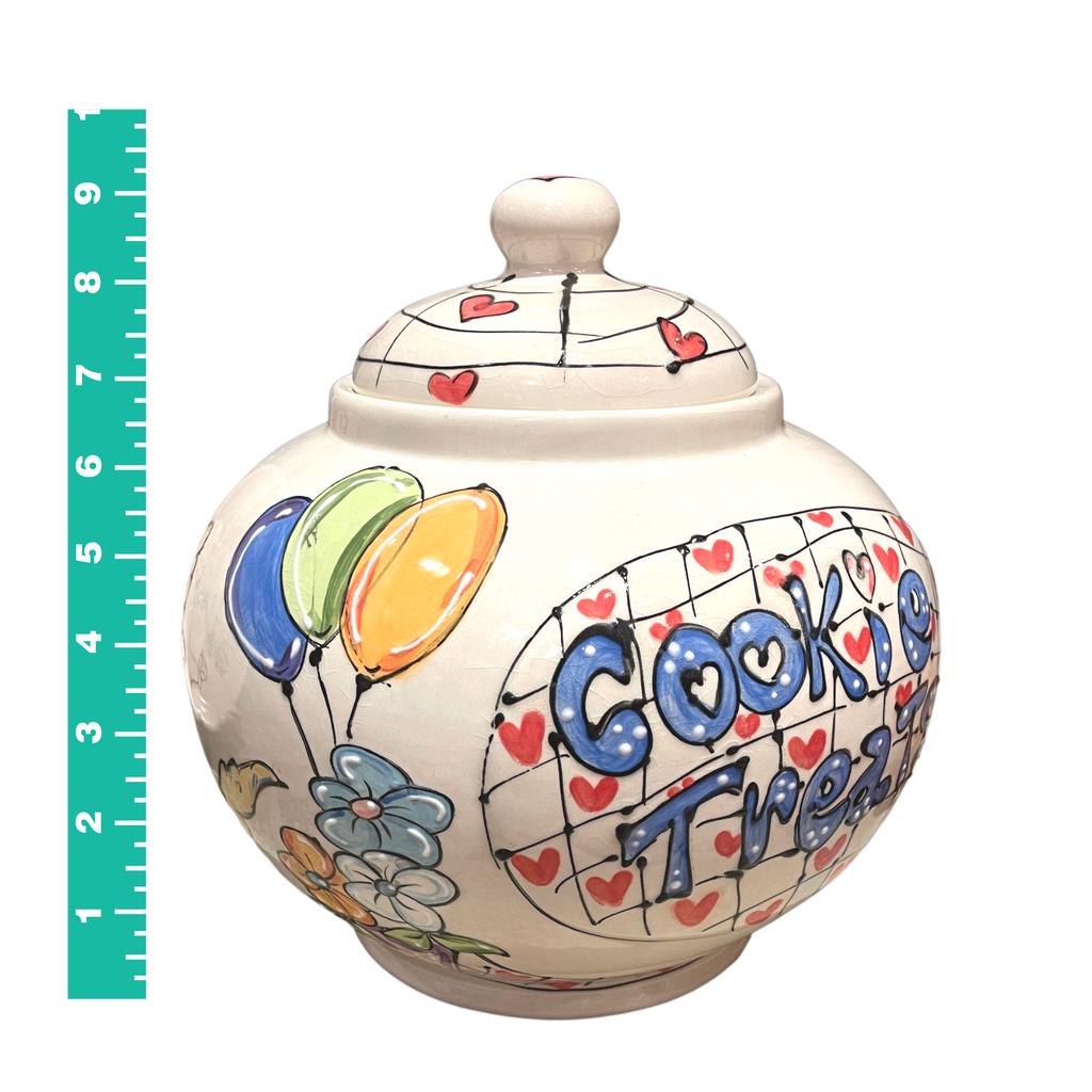Each treat jar is hand thrown from the finest white porcelain china, hand-drawn, hand-painted, bisque fired for 16 hours, glazed with three hand-brushed applications, and finish fired for 8 more hours. Rubber gasket secure freshness seal. Food safe, dishwasher safe, non-toxic, and lead-free.