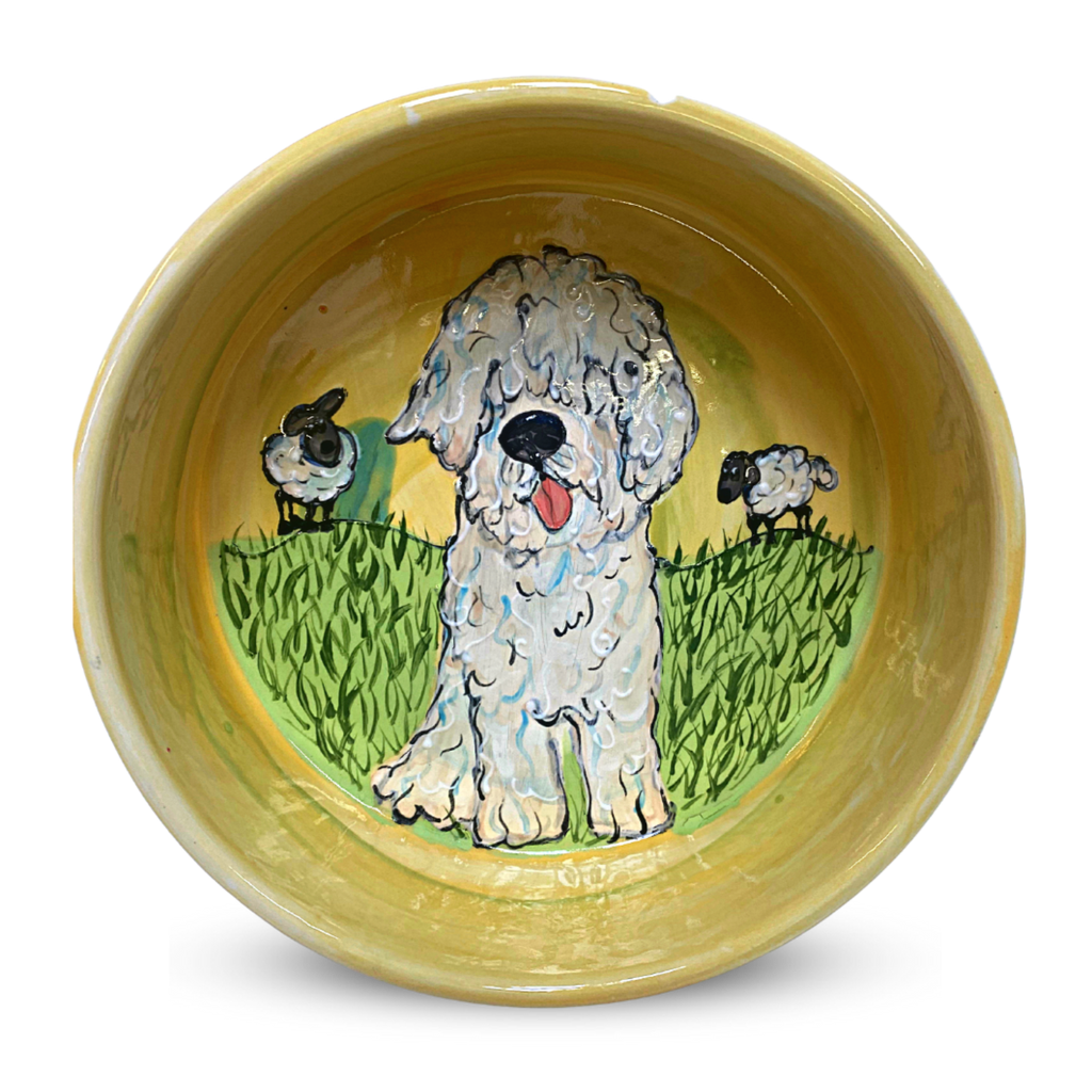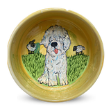This ceramic food/water bowl features an adorable Old English Sheepdog and hand-mixed background color for a pleasing aesthetic.