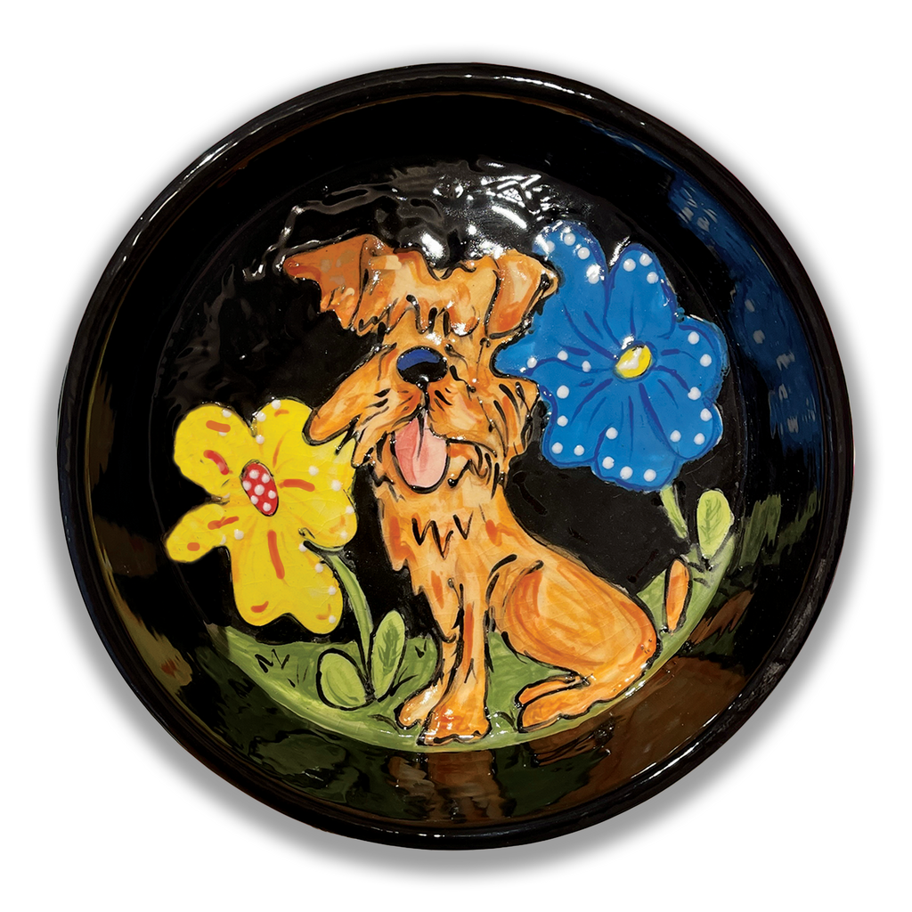 Wheaten doggie shown on ceramic pottery food/water bowl with complimenting hand-mixed background color.
