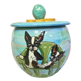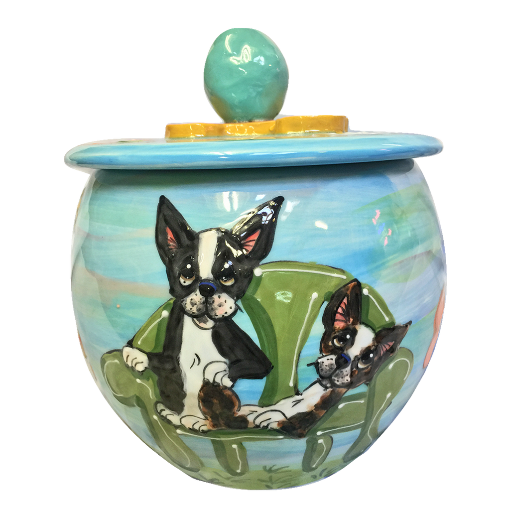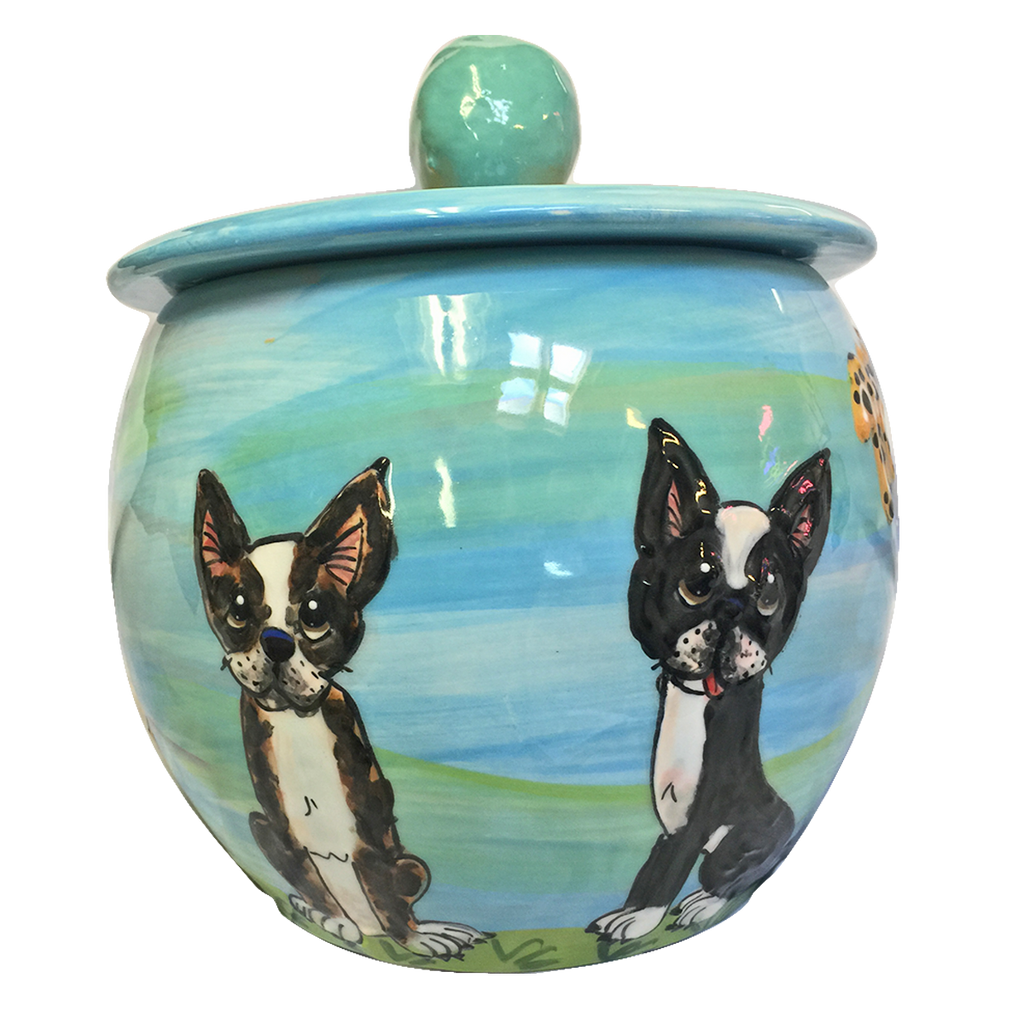 Boston Terrier treat jar hand-painted by Debby Carman.