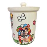 Each treat jar is hand thrown from the finest white porcelain china, hand-drawn, hand-painted, bisque fired for 16 hours, glazed with three hand-brushed applications, and finish fired for 8 more hours. Rubber gasket secure freshness seal. Food safe, dishwasher safe, non-toxic, and lead-free.