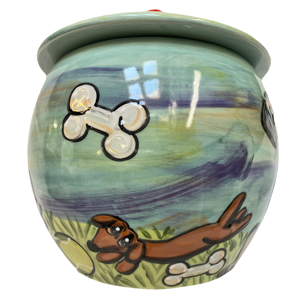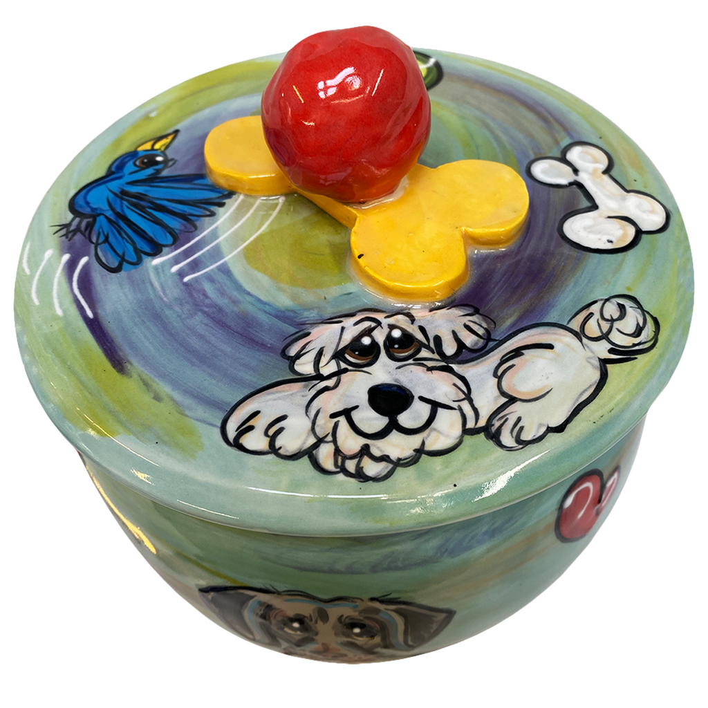 Each treat jar is hand thrown from the finest white porcelain china, hand-drawn, hand-painted, bisque fired for 16 hours, glazed with three hand-brushed applications, and finish fired for 8 more hours. Rubber gasket secure freshness seal. Food safe, dishwasher safe, non-toxic, and lead-free.