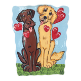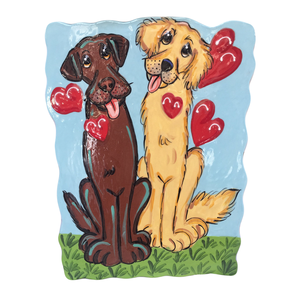 Let your heart be charmed by our 'Puppy Love' ceramic tile, featuring a loving Labrador and a gentle Golden Retriever with whimsical heart balloons. Celebrate the affectionate nature of these beloved breeds with a hand-sculpted and painted work of art by Debby Carman. This joyful tile is a testament to unconditional love and makes a beautiful gift for Valentine's Day, anniversaries, or as a token of affection. Handmade with care, we kindly request 4 weeks to perfect and ship your custom piece.