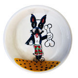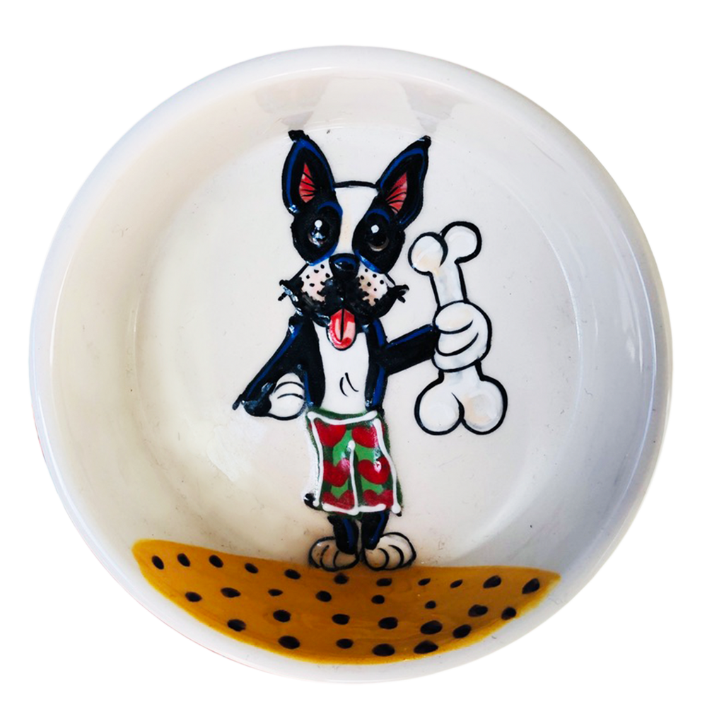 Adorable Boston Terrier doggie shown on this ceramic food/water bowl with complimenting hand-mixed background color.