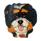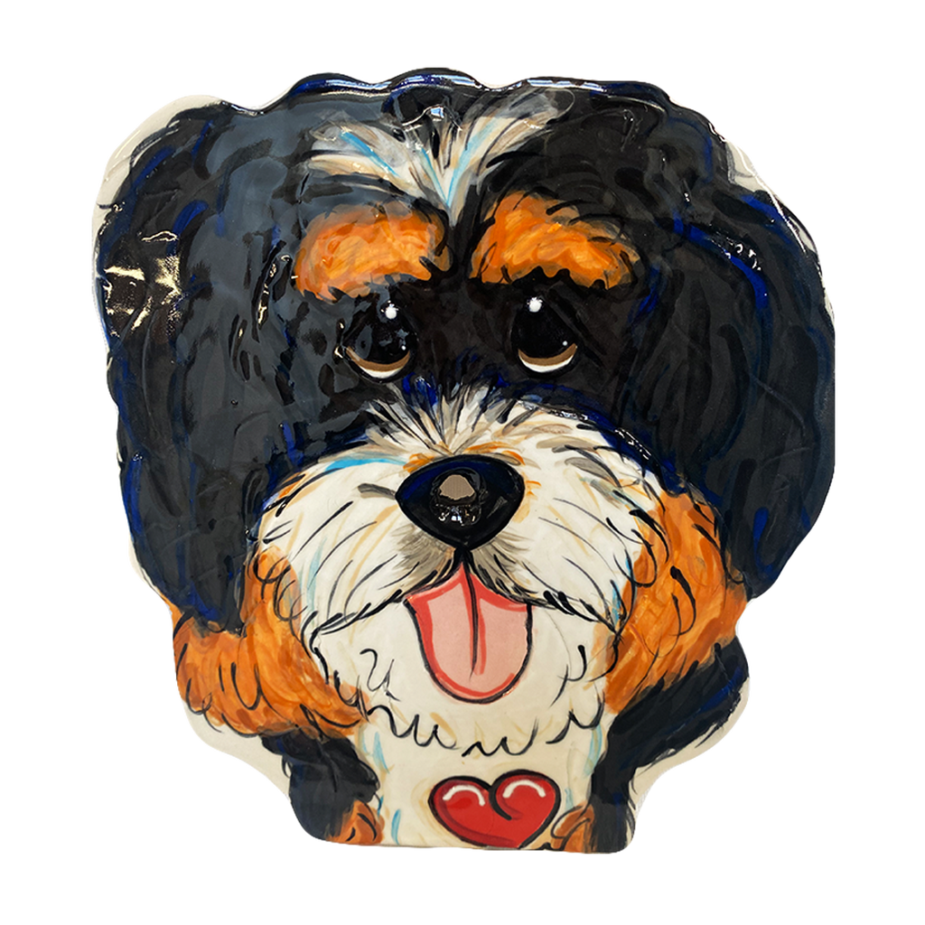 Whimsical, original, hand painted, clay sculpted Bernese Mountain Dog ceramic tile, wall decor art work ready for hanging.