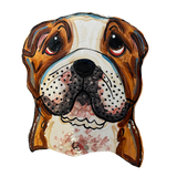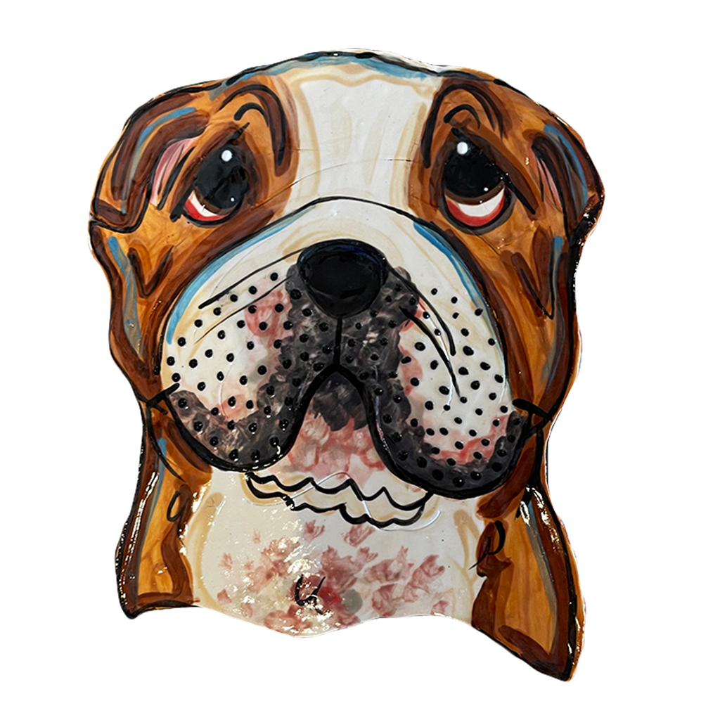 Whimsical, original, hand painted, clay sculpted English Bulldog on ceramic tile, wall decor art work ready for hanging.
