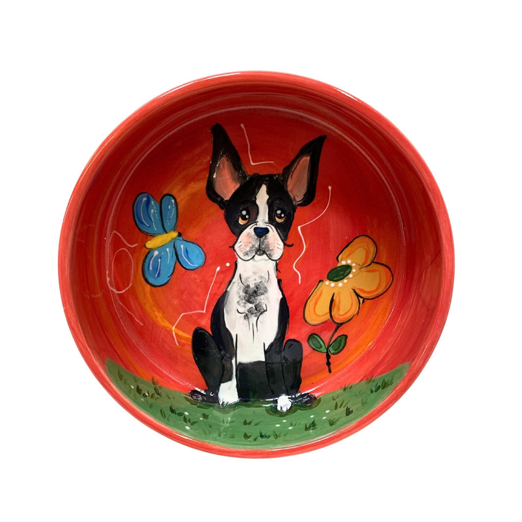 Introducing the "Pawfect Boston Buddy Bowl" - where every meal becomes a tail-wagging soiree! Crafted with love and a touch of whimsy, this hand-painted 8-inch ceramic masterpiece features a charming Boston Terrier, poised and ready to be your furry friend's mealtime companion. Each bowl is a unique treasure, personalized and signed by the renowned pet portraitist, Debby Carman. Revel in the vibrant red backdrop that makes feeding time a colorful adventure. Made with pride in the USA, our ceramic bowl ensures safety for your pet with food-safe materials and is a breeze to clean, being both microwave and dishwasher safe. Let your pet dine in style with a bowl as delightful and unique as they are!
