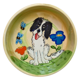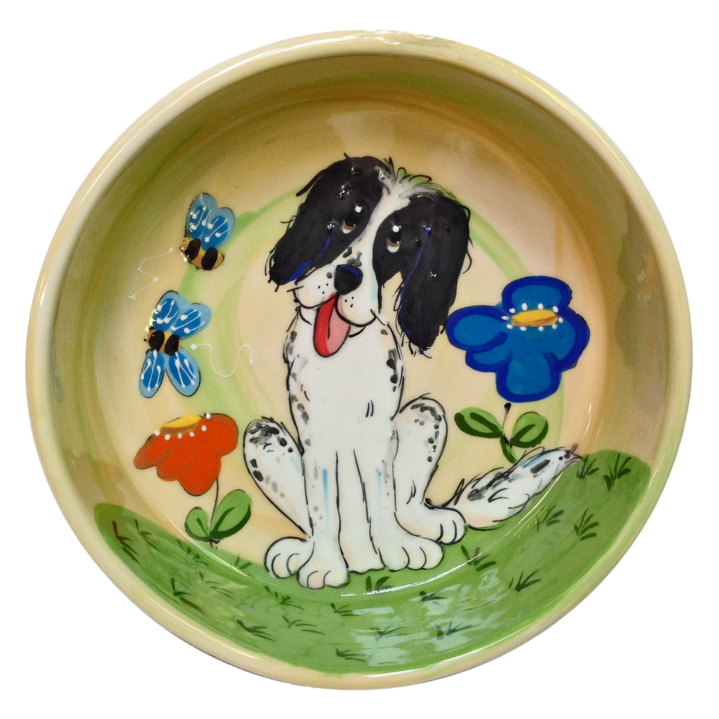 愛らしいイングリッシュ スプリンガー スパニエルの犬がこの陶器の餌/水のボウルに描かれています。手で混ぜた背景色を引き立てます。