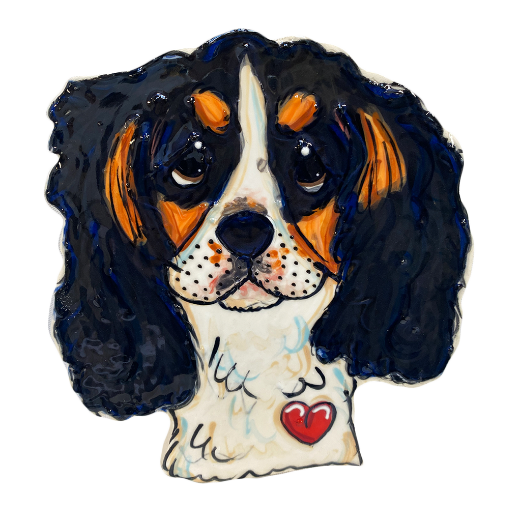 Whimsical, original, hand painted, clay sculpted King Charles Cavalier Spaniel ceramic tile, wall decor art work ready for hanging.