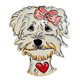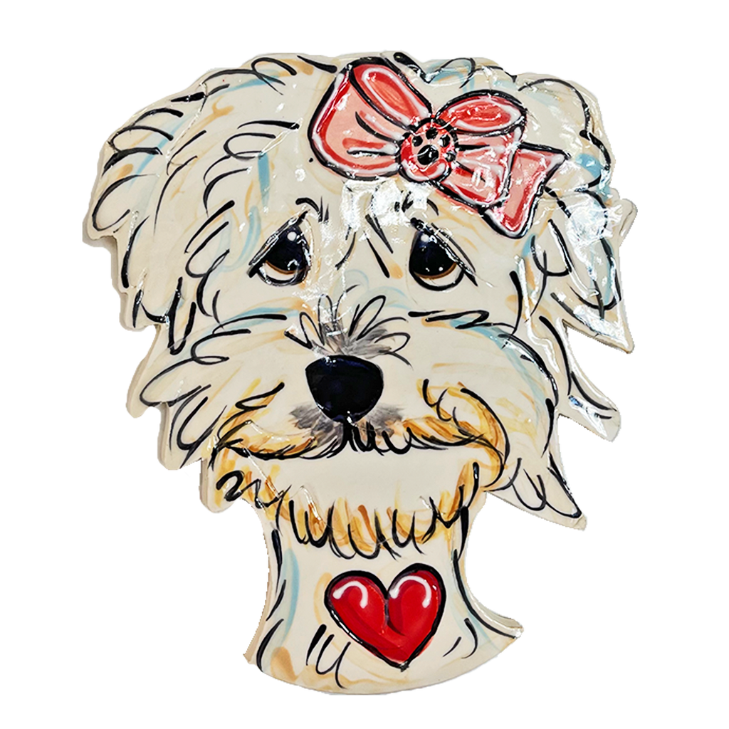 Whimsical, original, hand painted, clay sculpted Maltese on ceramic tile, wall decor art work ready for hanging.