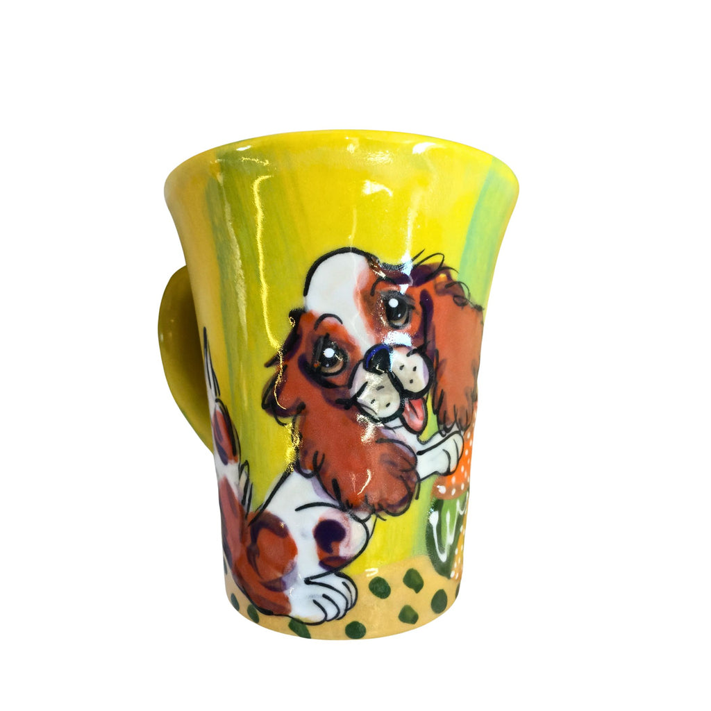 Let the "Sunny Spaniel Sipper" brighten your day with the heartwarming charm of a Cavalier King Charles Spaniel. This delightful 16 oz mug is a canvas of cheer, hand-painted with a frolicking Cavalier, its lush ears and warm, puppy eyes inviting you to relax and enjoy your favorite beverage. Debby Carman's artistic touch adds personality and joy to this ceramic piece, making it a sunny addition to any dog lover's mug collection.