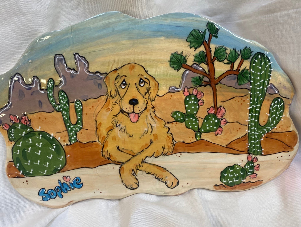 This hand-sculpted and hand-painted tile depicts your Golden Retriever amidst a sprawling desert landscape, complete with radiant sun, blooming cacti, and rolling mountains. It's a vibrant, cheerful portrayal that captures both the beauty of the desert and the spirit of your pet. Crafted with passion, this tile is an ideal piece for any room, and a thoughtful gift for Golden Retriever enthusiasts. Please note, each custom tile requires 4 weeks for creation and delivery.