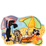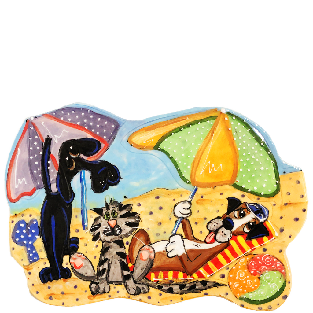 Escape to a whimsical seaside adventure with our 'Seaside Frolic' ceramic tile, featuring the delightful antics of a playful dog and cat duo under colorful beach umbrellas. Each tile is lovingly hand-sculpted and painted by artist Debby Carman, capturing the playful spirit of your pets in a vibrant beach setting. The design boasts vivid beach balls, refreshing waves, and sandy shores, making it a perfect sunny addition to any pet lover's collection. Crafted on order, this tile is a splendid gift and a cheerful home accent. Allow 4 weeks for delivery.