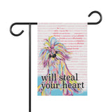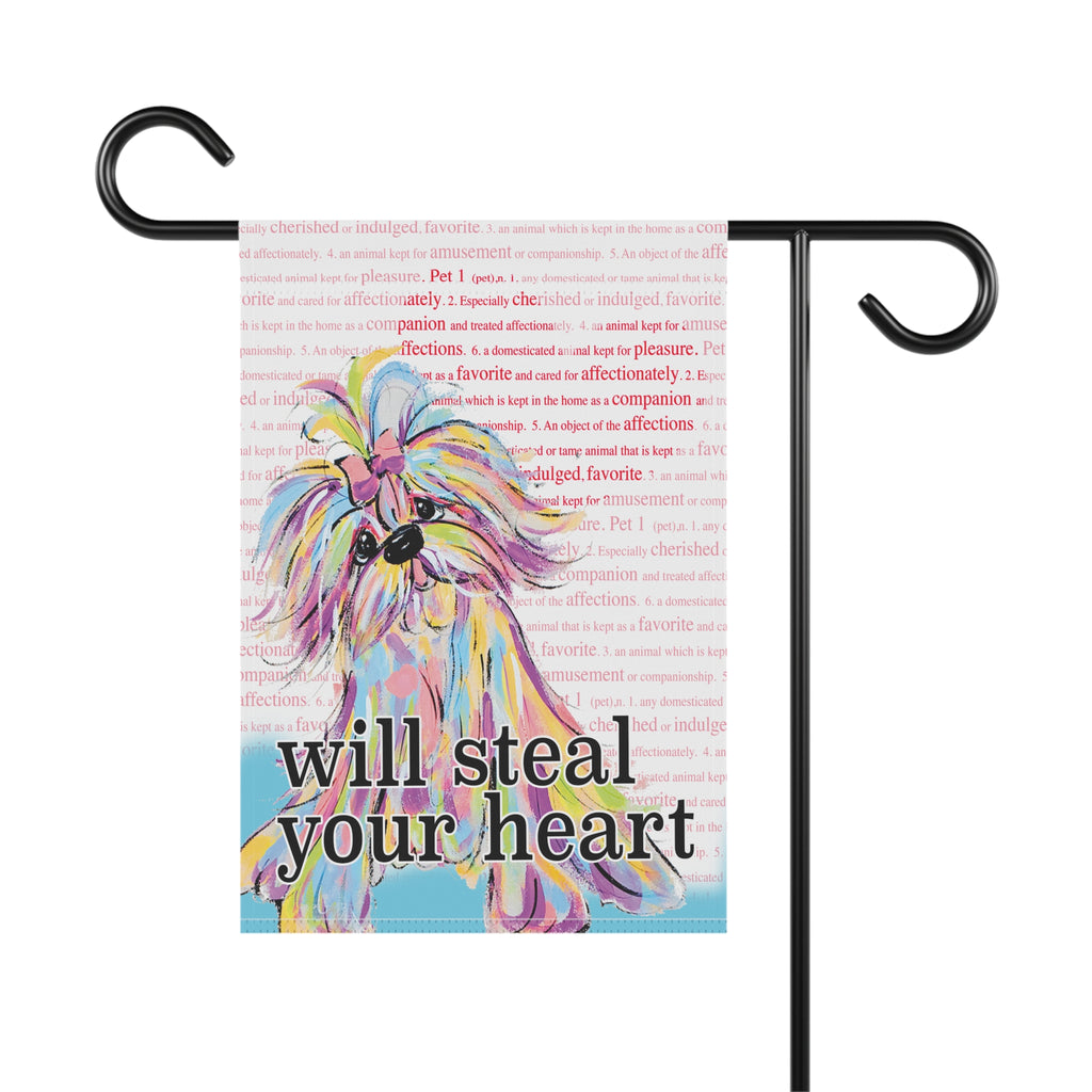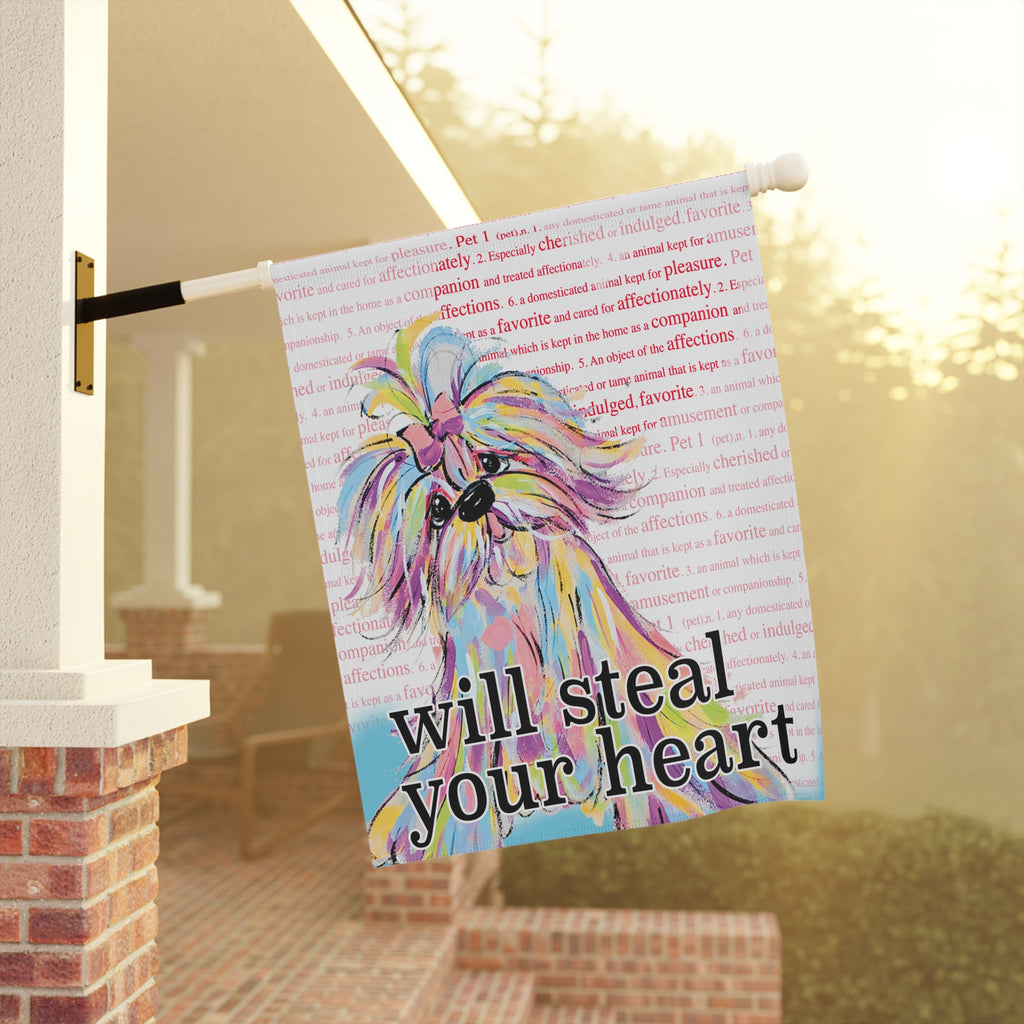Let your heart be captivated with our 'Heart Thief Canine Garden Flag and House Banner'. This adorable addition to your outdoor or indoor decor features a sweet, colorful dog that is sure to 'steal your heart'. Set against a backdrop that gives a nod to the dictionary definition of 'Pet', this design merges whimsy with a touch of education. Available in two sizes to suit your space - 12" x 18" for a subtle charm in your garden or 24.5" x 32" for a more prominent declaration of love on your house front. Made from durable materials, these flags and banners are designed to withstand the elements, making them a perfect way to express your love for furry friends all year round.