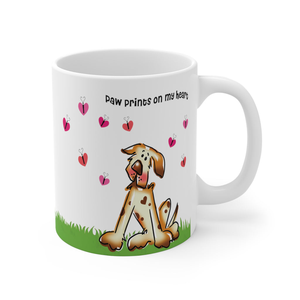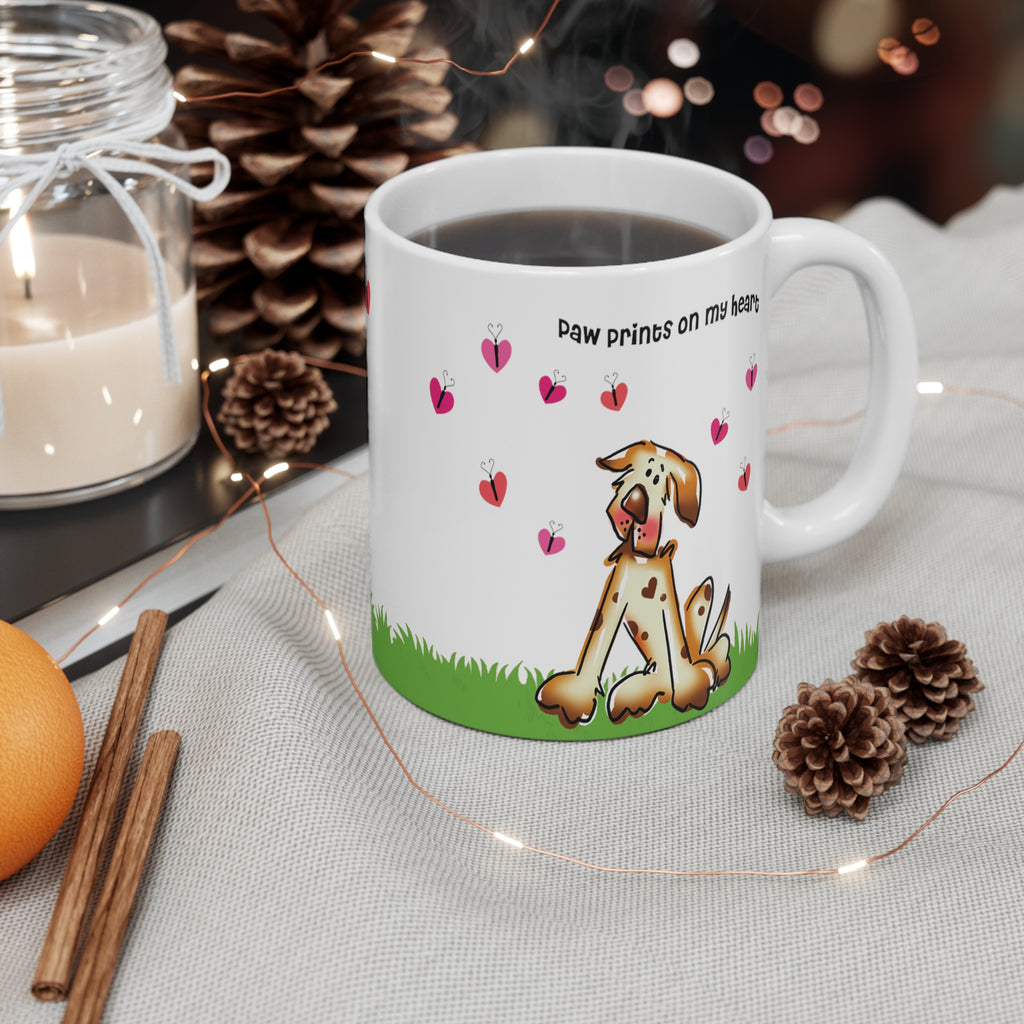 Embrace the paw-fect love with our "Paws & Hearts" 11oz ceramic mug, exclusively from FauxPaw.com! Decorated with a playful scene of a dog leaving paw prints amidst a shower of hearts, this mug says "paw prints on my heart" in a sweet, whimsical font. It's a daily reminder of the special bond between dogs and their humans. This mug is made with durable ceramic, ideal for both hot and cold drinks, and is both microwave and dishwasher safe. It's a wonderful gift for any dog lover who wants to add a touch of canine cuteness to their daily routine.