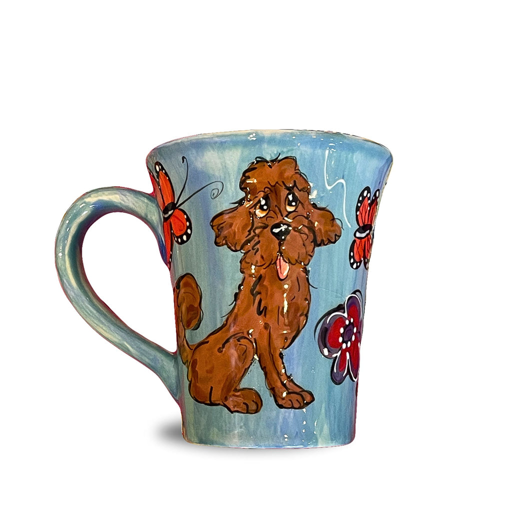 Float into your day with the "Mini Doodle Butterfly Kisses Mug," where the gentle whimsy of a Miniature Doodle meets the delicate beauty of butterflies. Surrounded by fluttering friends on a serene blue background, this mug captures the playful and loving spirit of the Mini Doodle breed, all hand-painted with meticulous detail and vibrant hues.